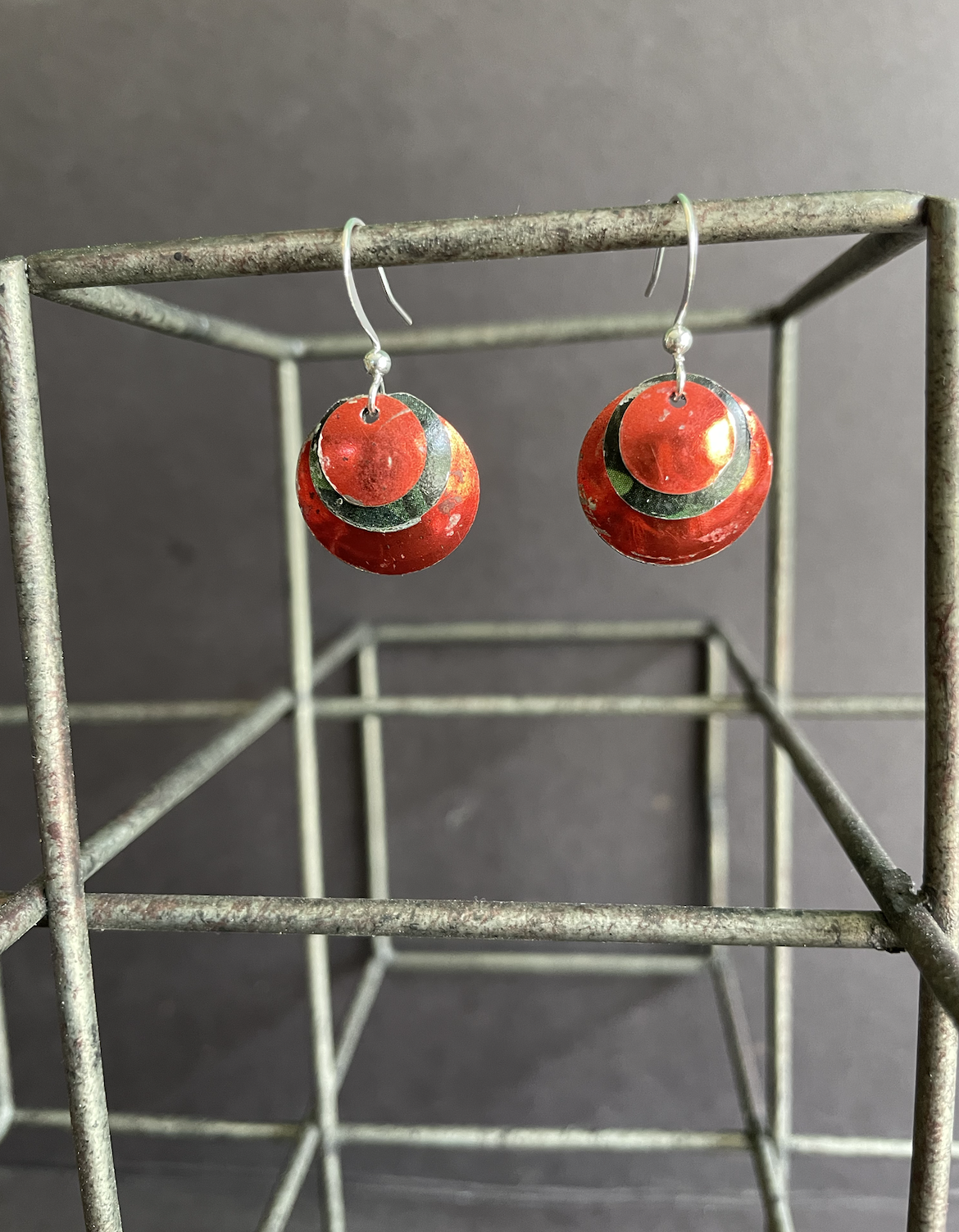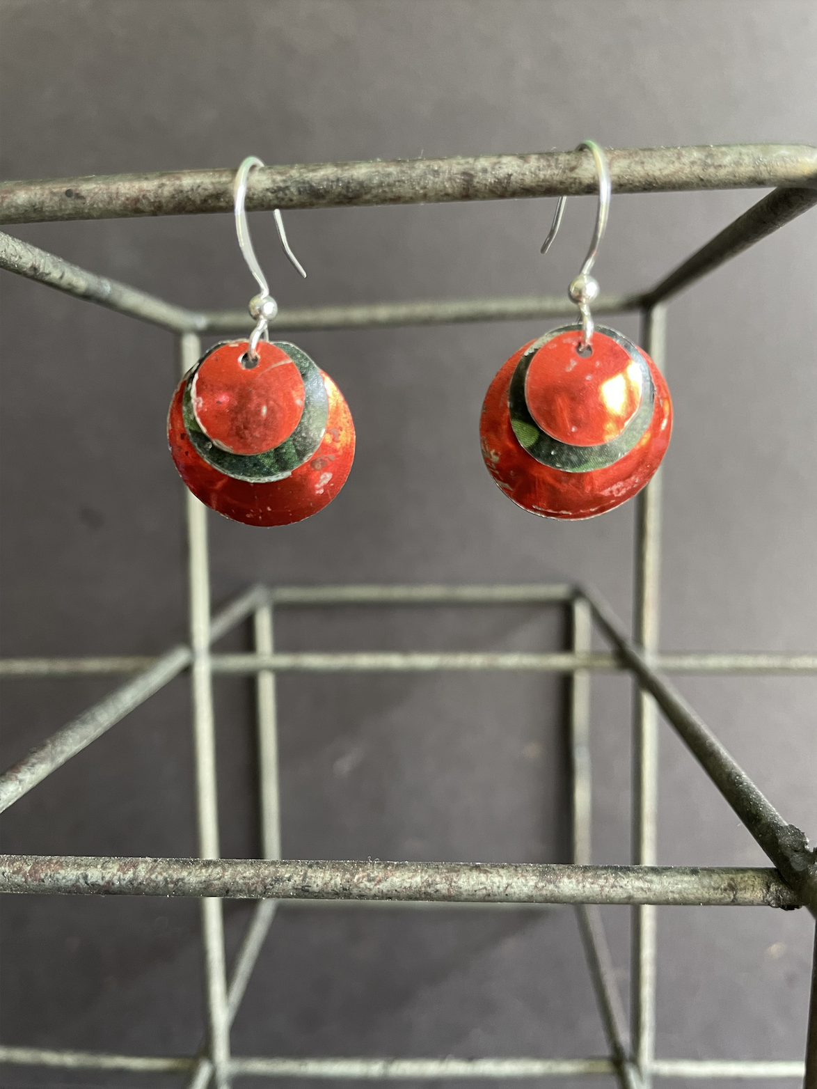 Tins are very light making them ideal for earrings as they don't weigh down your ears as the day goes on. Did you know the proper term for working with tin is "tinkering"? That made me really happy. I literally tinker in my art studio! I use old cookie tins, tea tins, and the like, break them down, and hand cut them into shapes and hand-hammer them into the 3-D shape I want them to be, finish and polish them, before putting them together like any other jewelry.