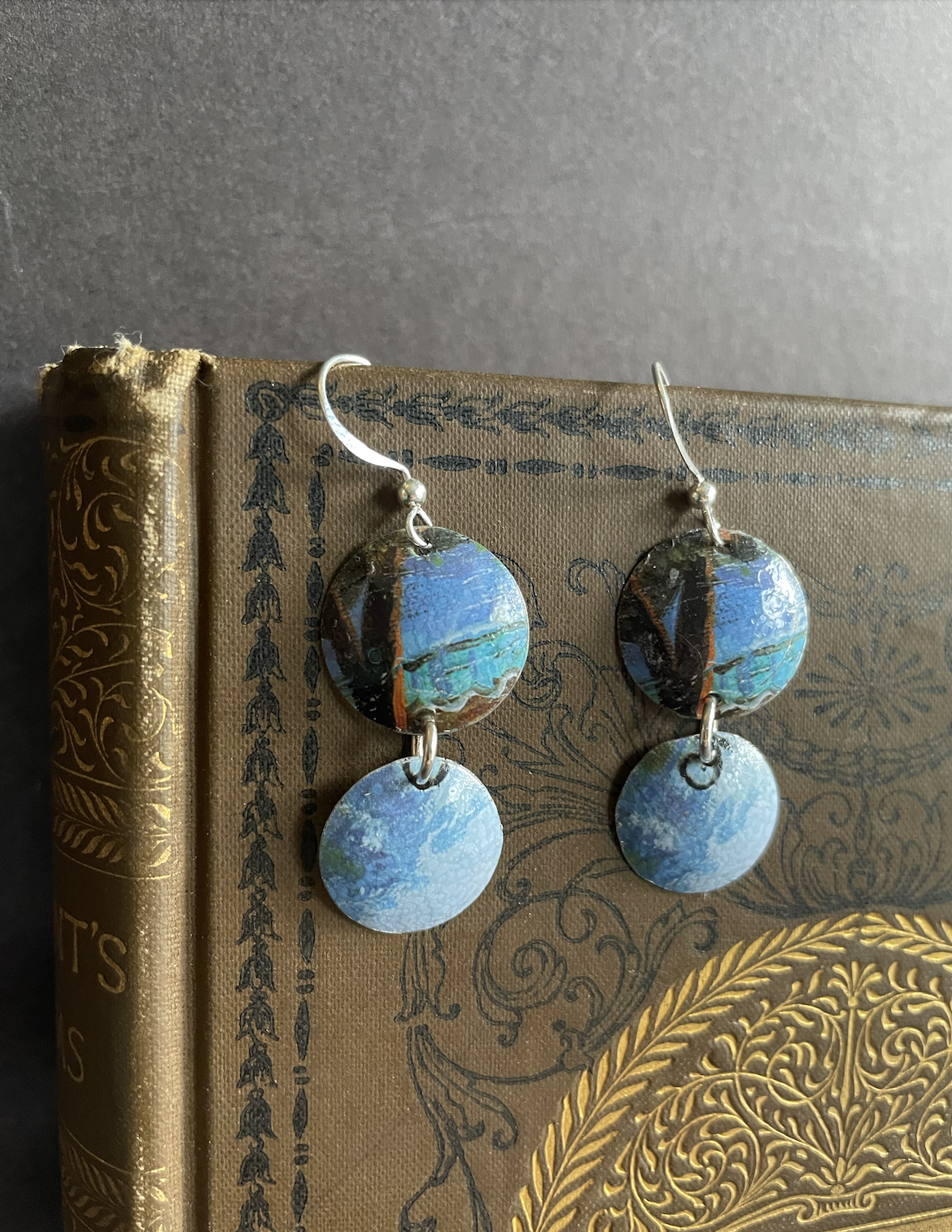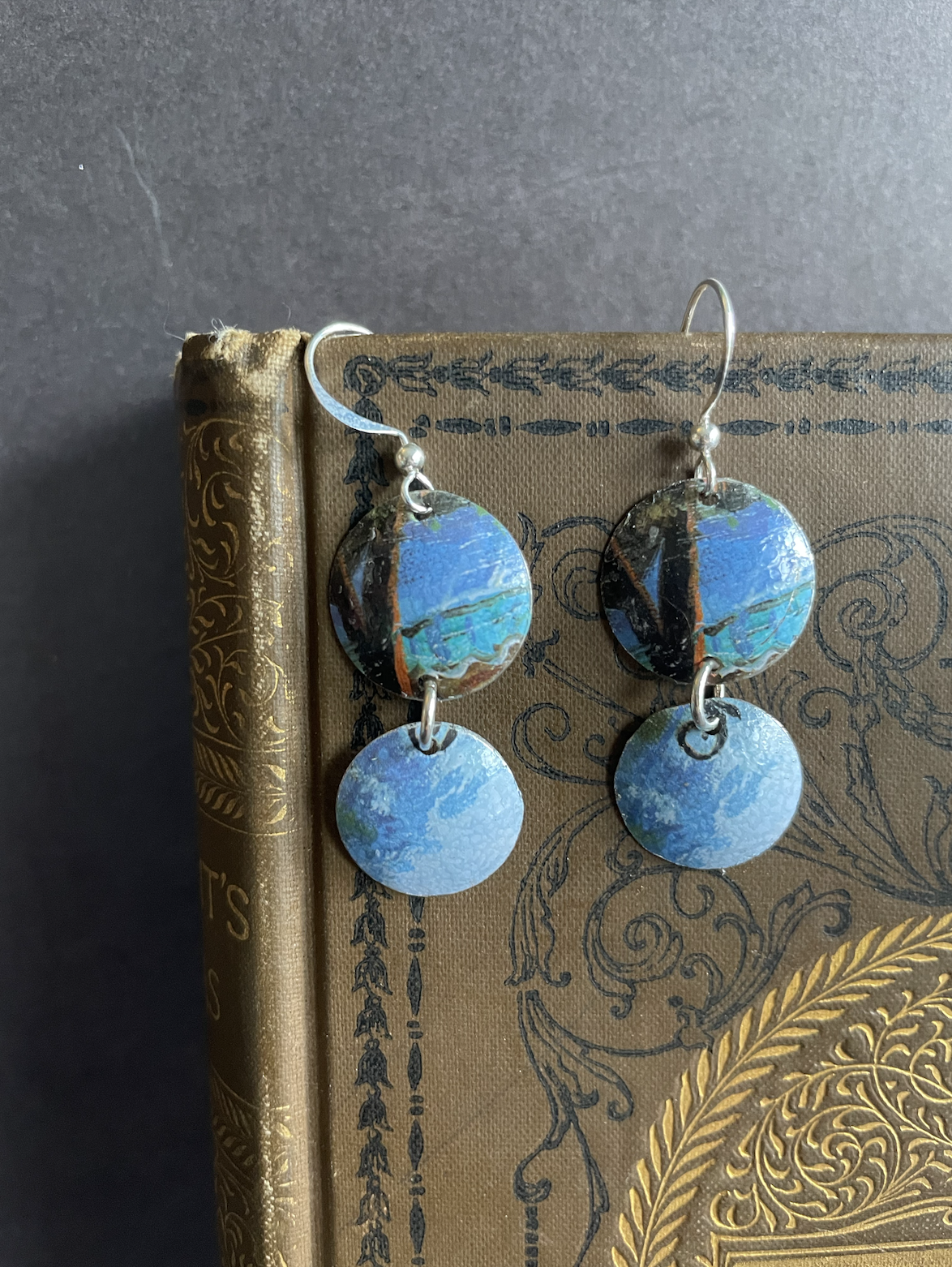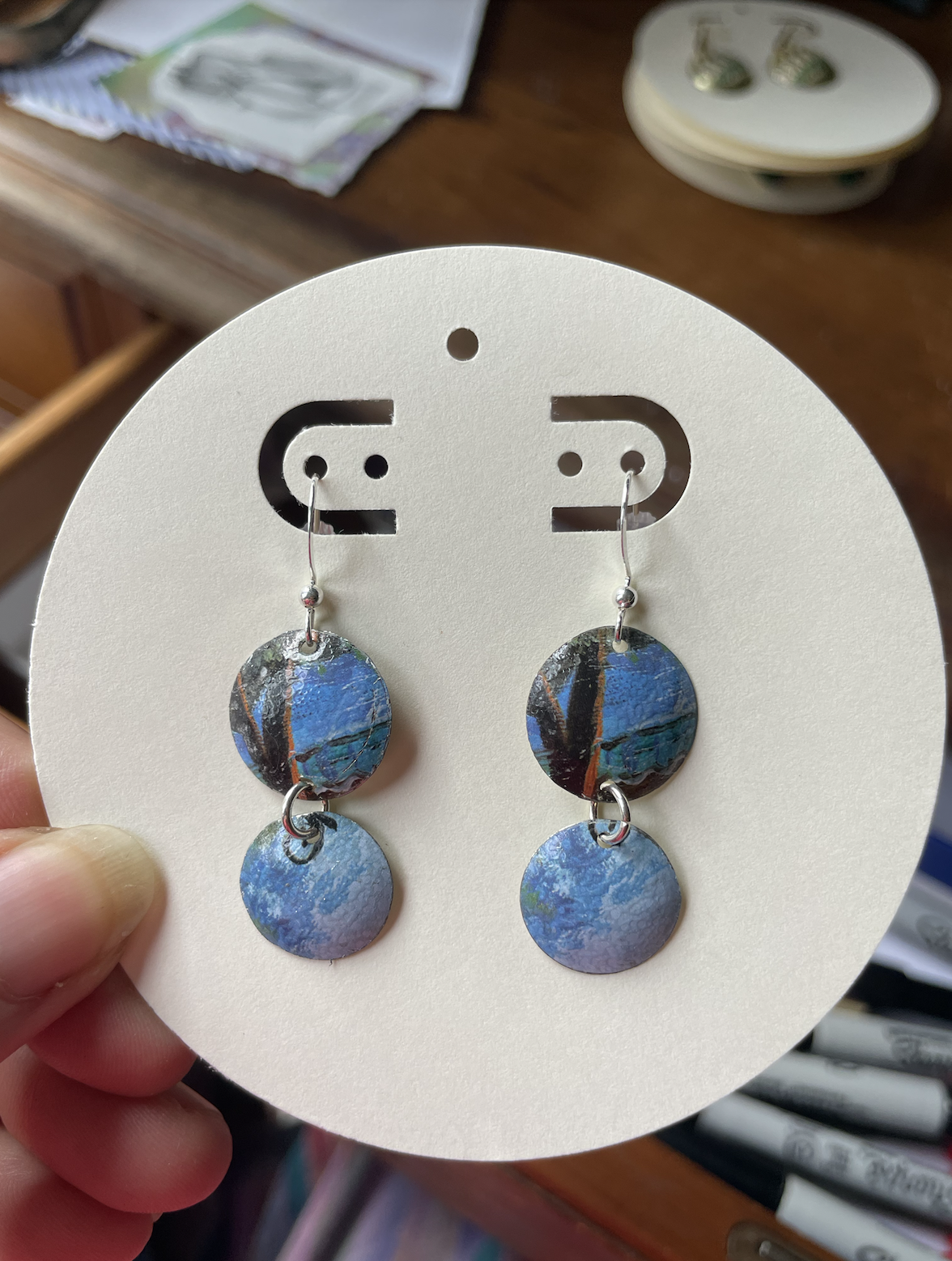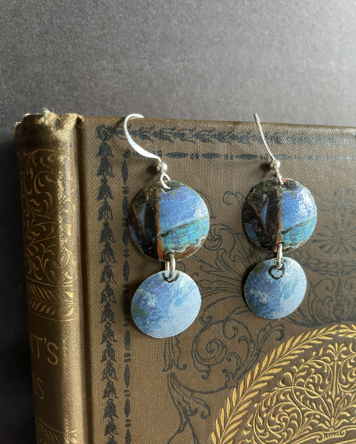 Tins are very light making them ideal for earrings as they don't weigh down your ears as the day goes on. Did you know the proper term for working with tin is "tinkering"? That made me really happy. I literally tinker in my art studio! I use old cookie tins, tea tins, and the like, break them down, and hand cut them into shapes and hand-hammer them into the 3-D shape I want them to be, finish and polish them, before putting them together like any other jewelry.