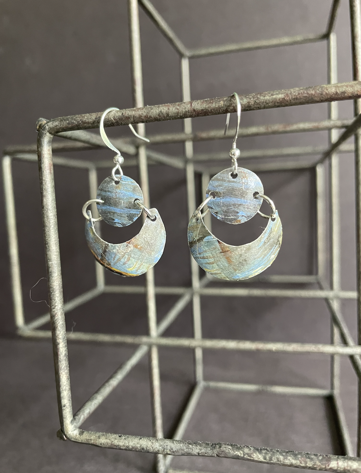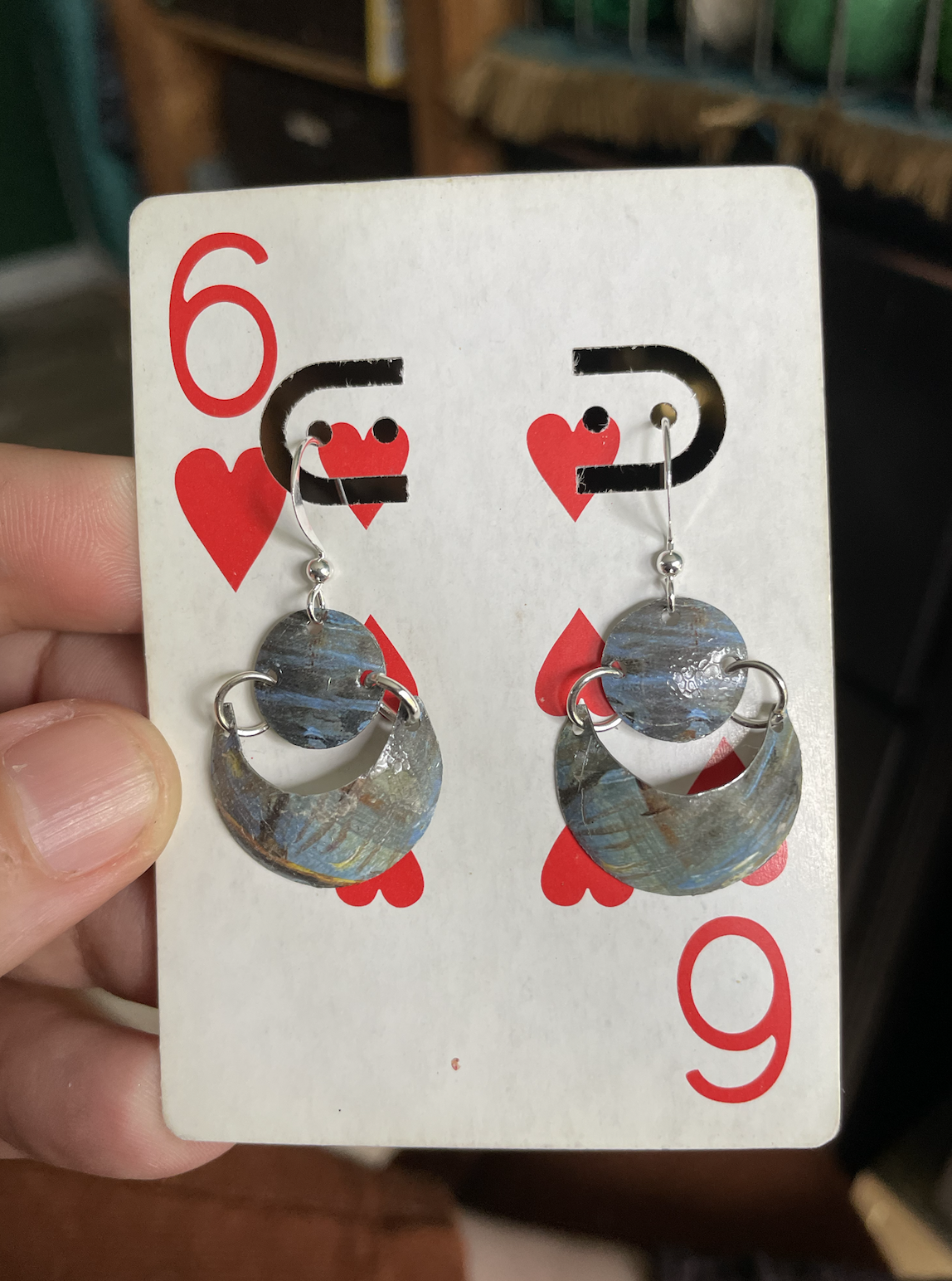 Tins are very light making them ideal for earrings as they don't weigh down your ears as the day goes on. Did you know the proper term for working with tin is "tinkering"? That made me really happy. I literally tinker in my art studio! I use old cookie tins, tea tins, and the like, break them down, and hand cut them into shapes and hand-hammer them into the 3-D shape I want them to be, finish and polish them, before putting them together like any other jewelry.