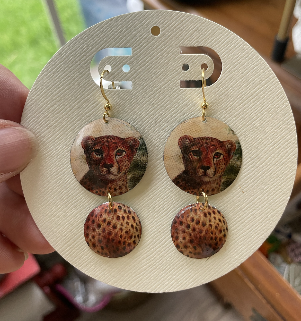 Down to earth African savannah and lovely cheetah. These silver plated earrings come with a rubber stopper so they won't fall out of your ears.