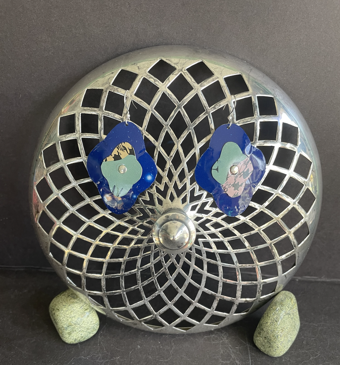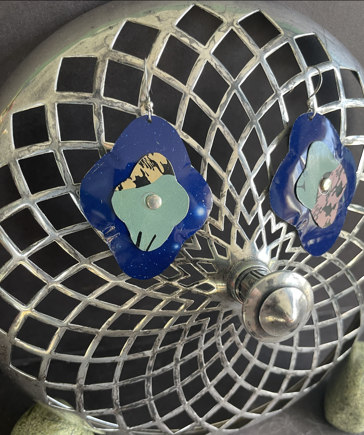 Tins are very light making them ideal for earrings as they don't weigh down your ears as the day goes on. Did you know the proper term for working with tin is "tinkering"? That made me really happy. I literally tinker in my art studio! I use old cookie tins, tea tins, and the like, break them down, and hand cut them into shapes and hand-hammer them into the 3-D shape I want them to be, finish and polish them, before putting them together like any other jewelry.