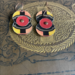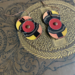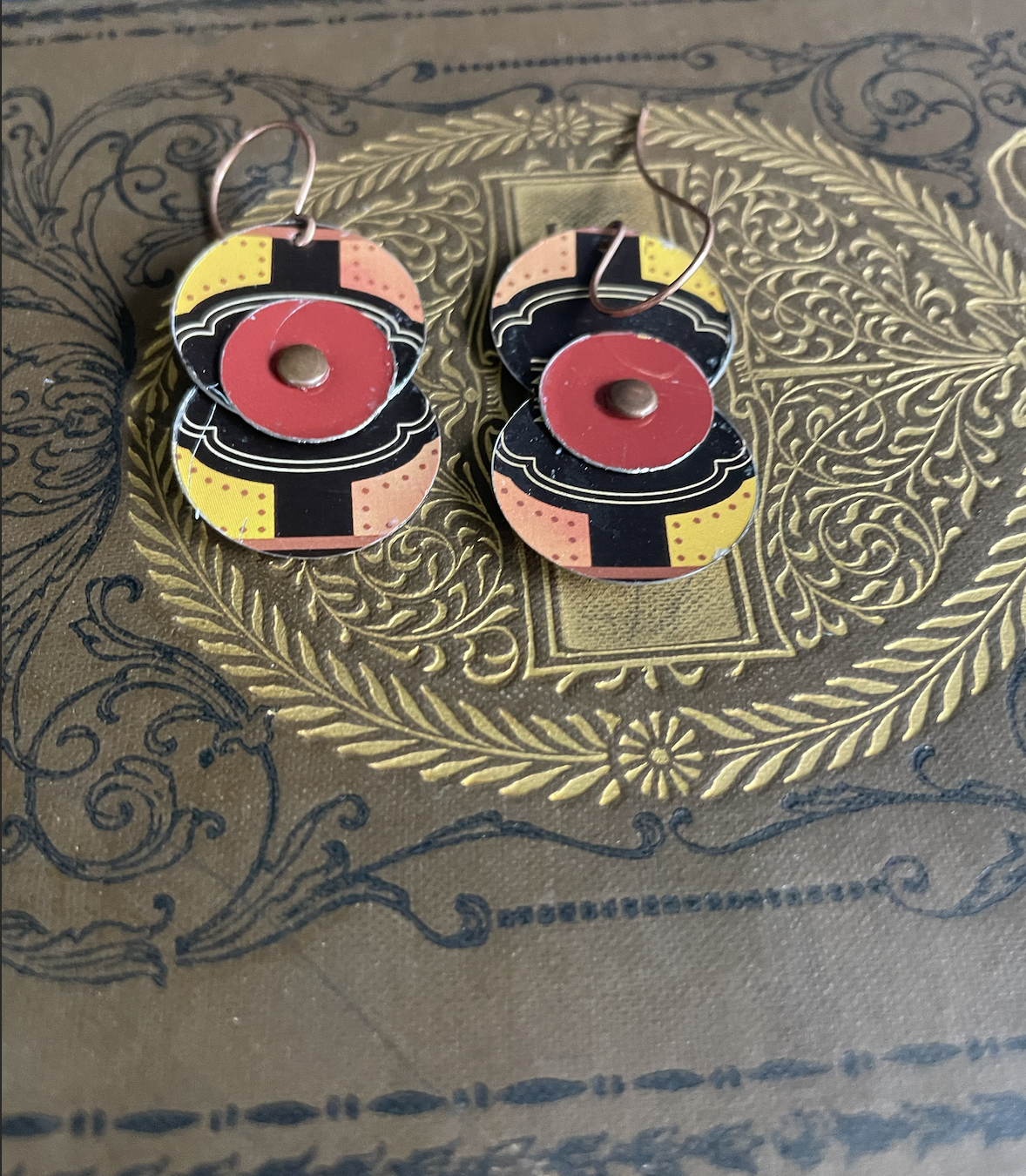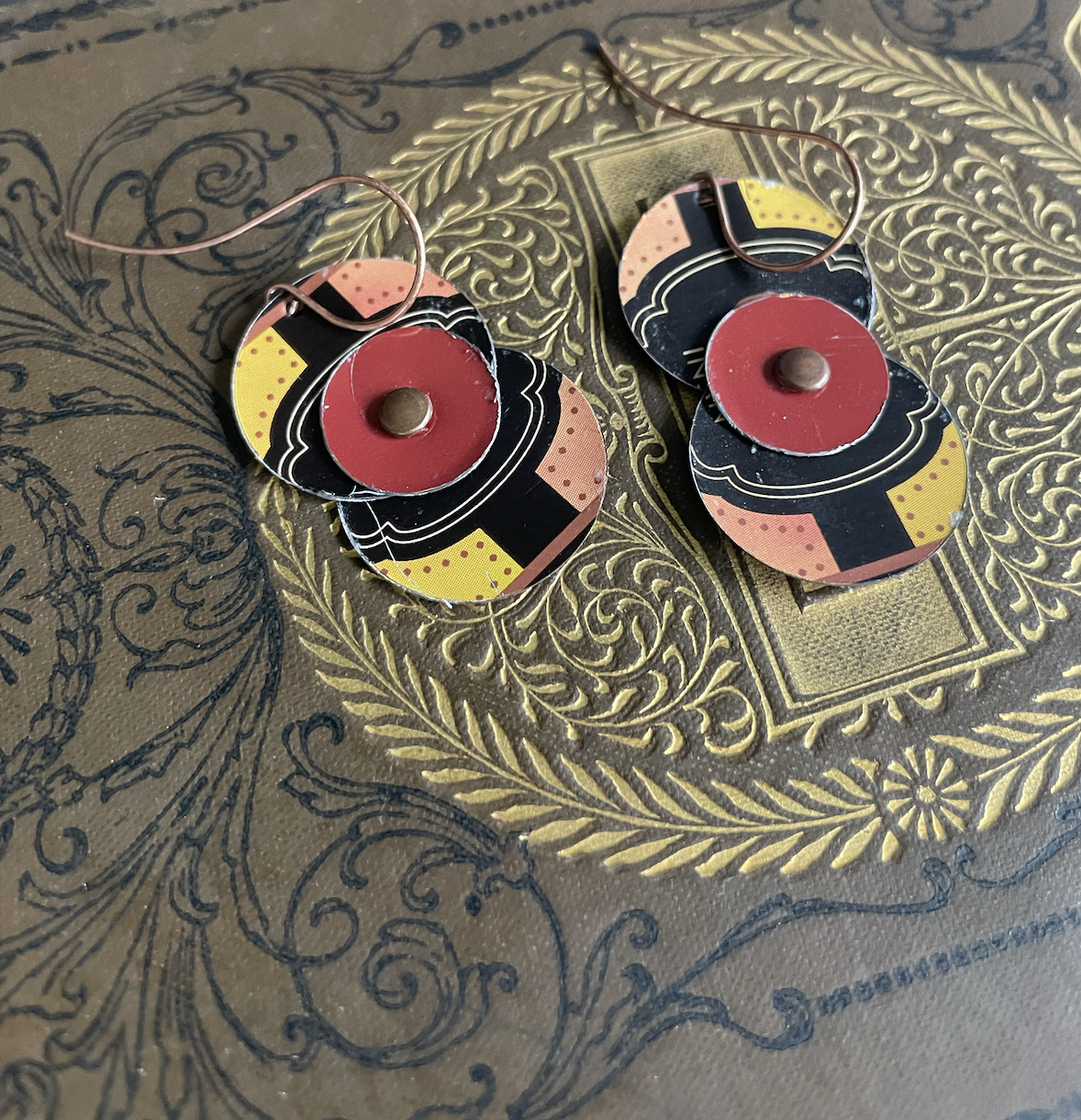 These earrings came from a tin of hot cocoa from Trader Joe's. The rivets and findings are copper and have a rubber stopper on the back so they won't fall out of your ears.