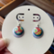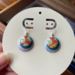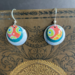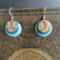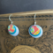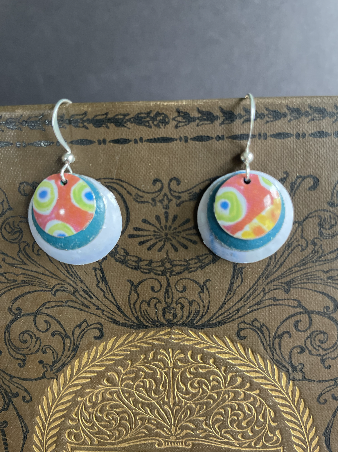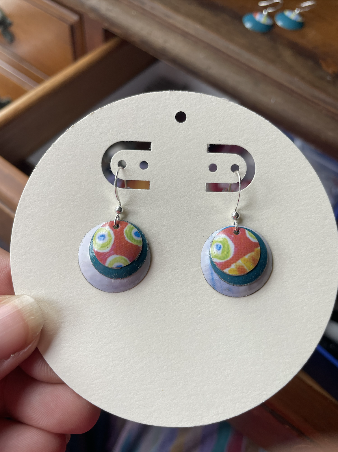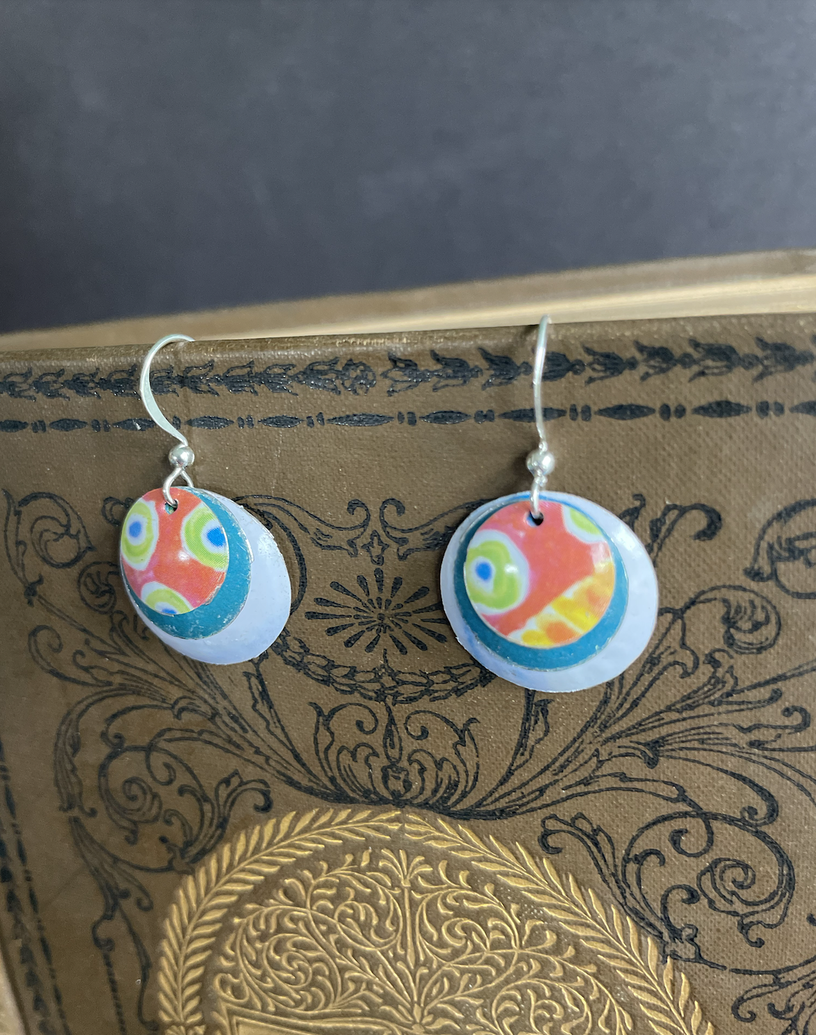 My original idea for making earrings out of tin was to do just this: nest several concave circles in one another. These specific nested earrings sport colorful dots on the center piece. These silver plated earrings come with a rubber stopper so they won't fall out of your ears.
