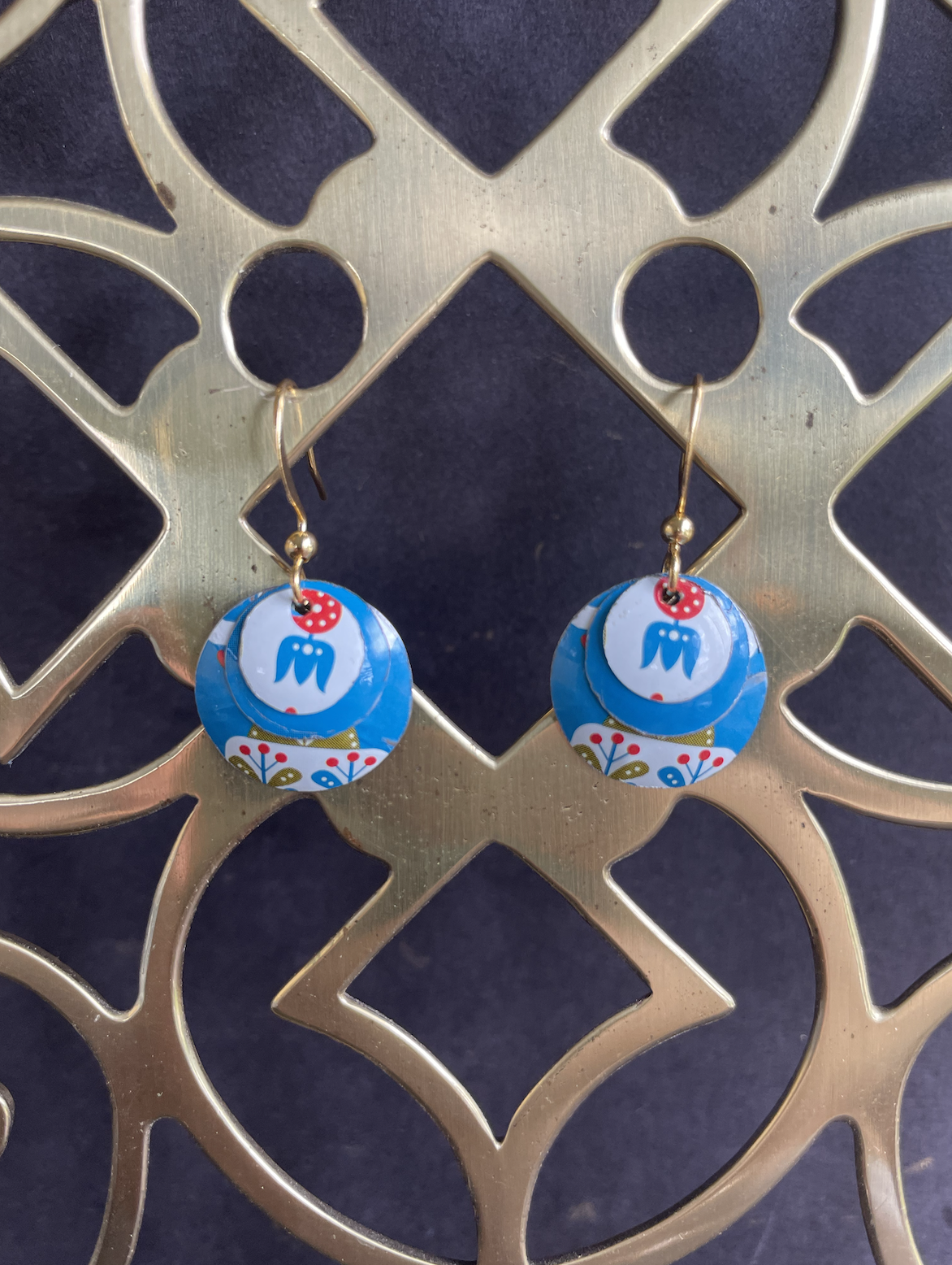 Tins are very light making them ideal for earrings as they don't weigh down your ears as the day goes on. Did you know the proper term for working with tin is "tinkering"? That made me really happy. I literally tinker in my art studio! I use old cookie tins, tea tins, and the like, break them down, and hand cut them into shapes and hand-hammer them into the 3-D shape I want them to be, finish and polish them, before putting them together like any other jewelry.