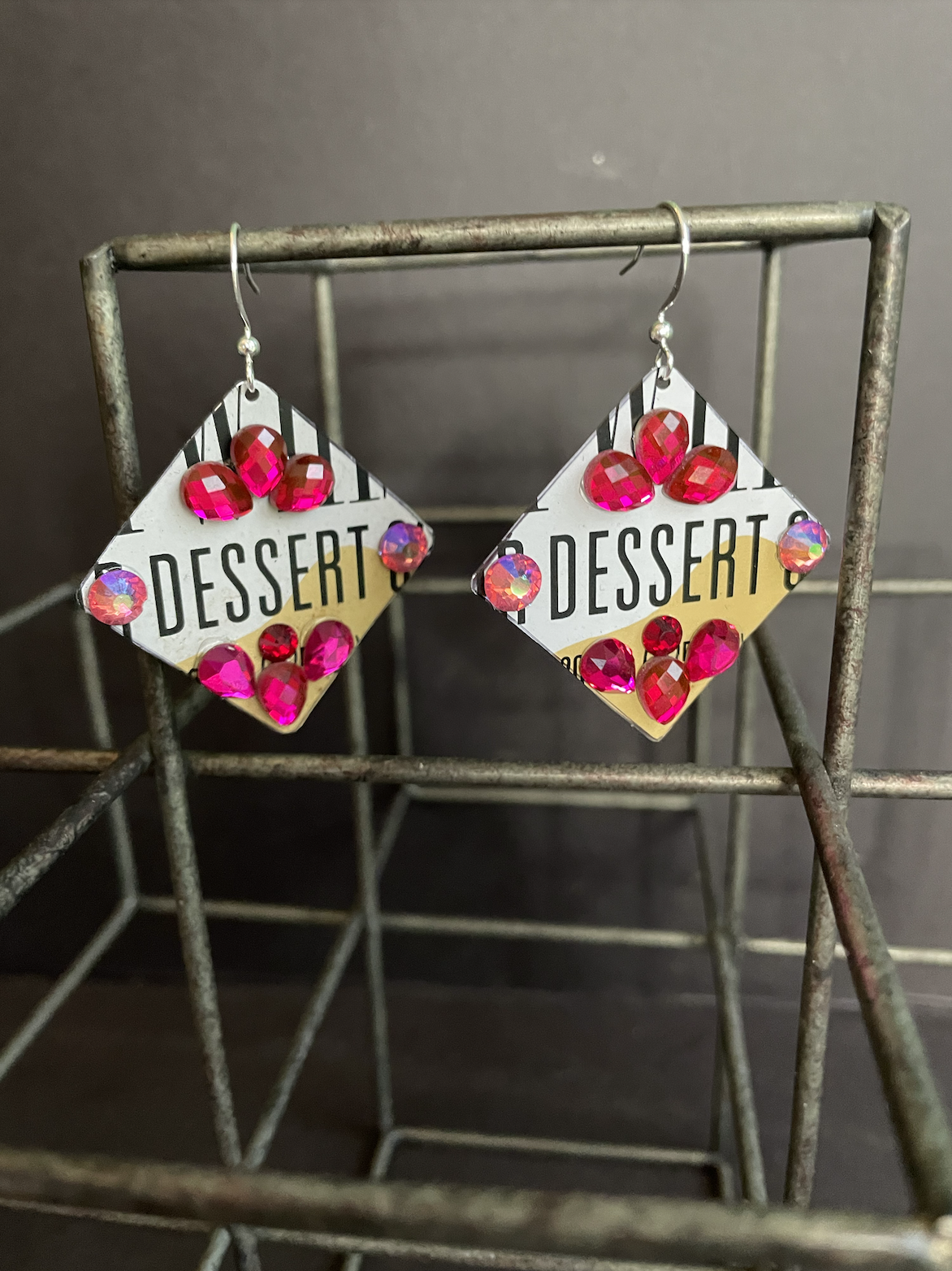 Tins are very light making them ideal for earrings as they don't weigh down your ears as the day goes on. Did you know the proper term for working with tin is "tinkering"? That made me really happy. I literally tinker in my art studio! I use old cookie tins, tea tins, and the like, break them down, and hand cut them into shapes and hand-hammer them into the 3-D shape I want them to be, finish and polish them, before putting them together like any other jewelry.
