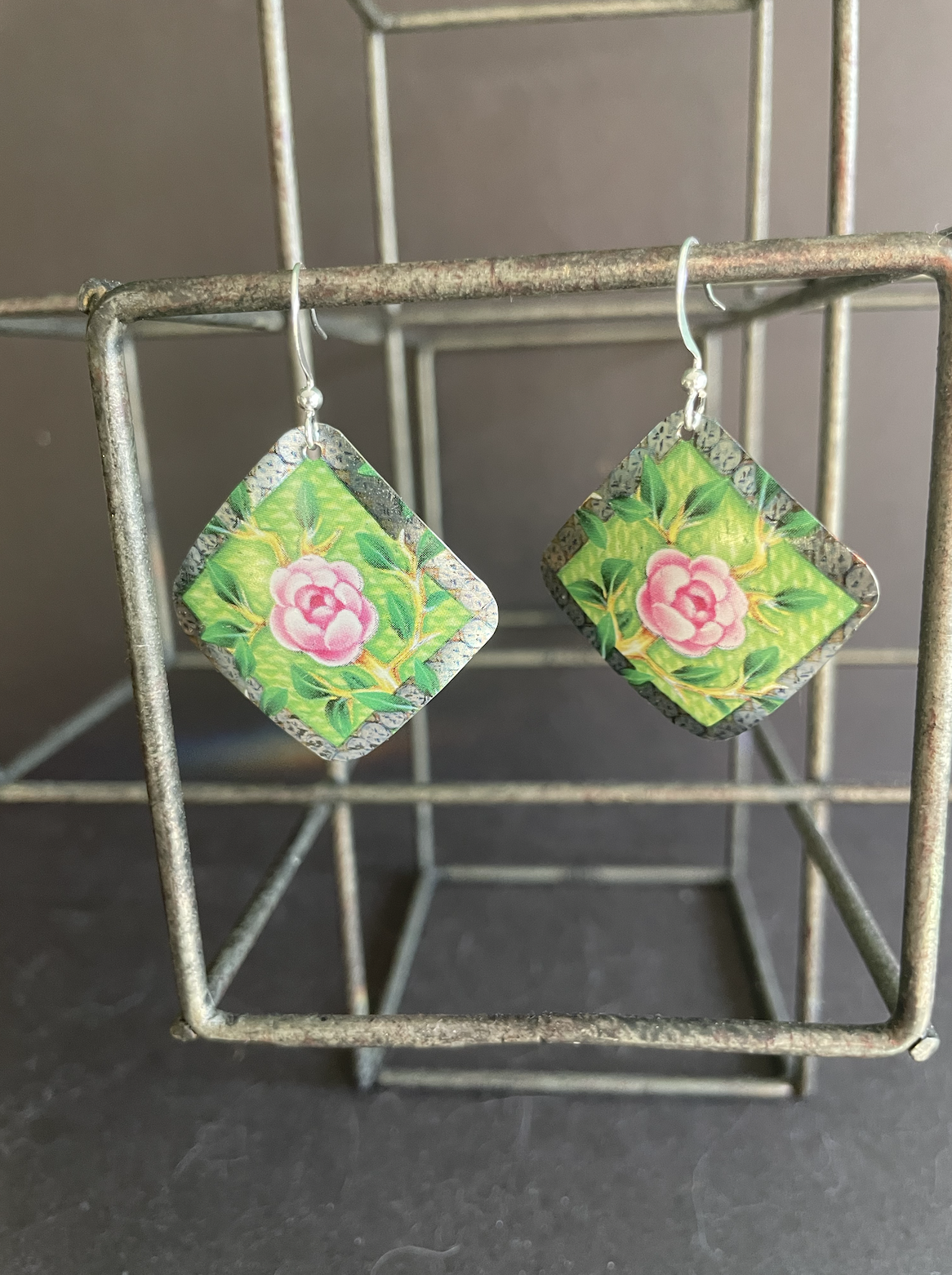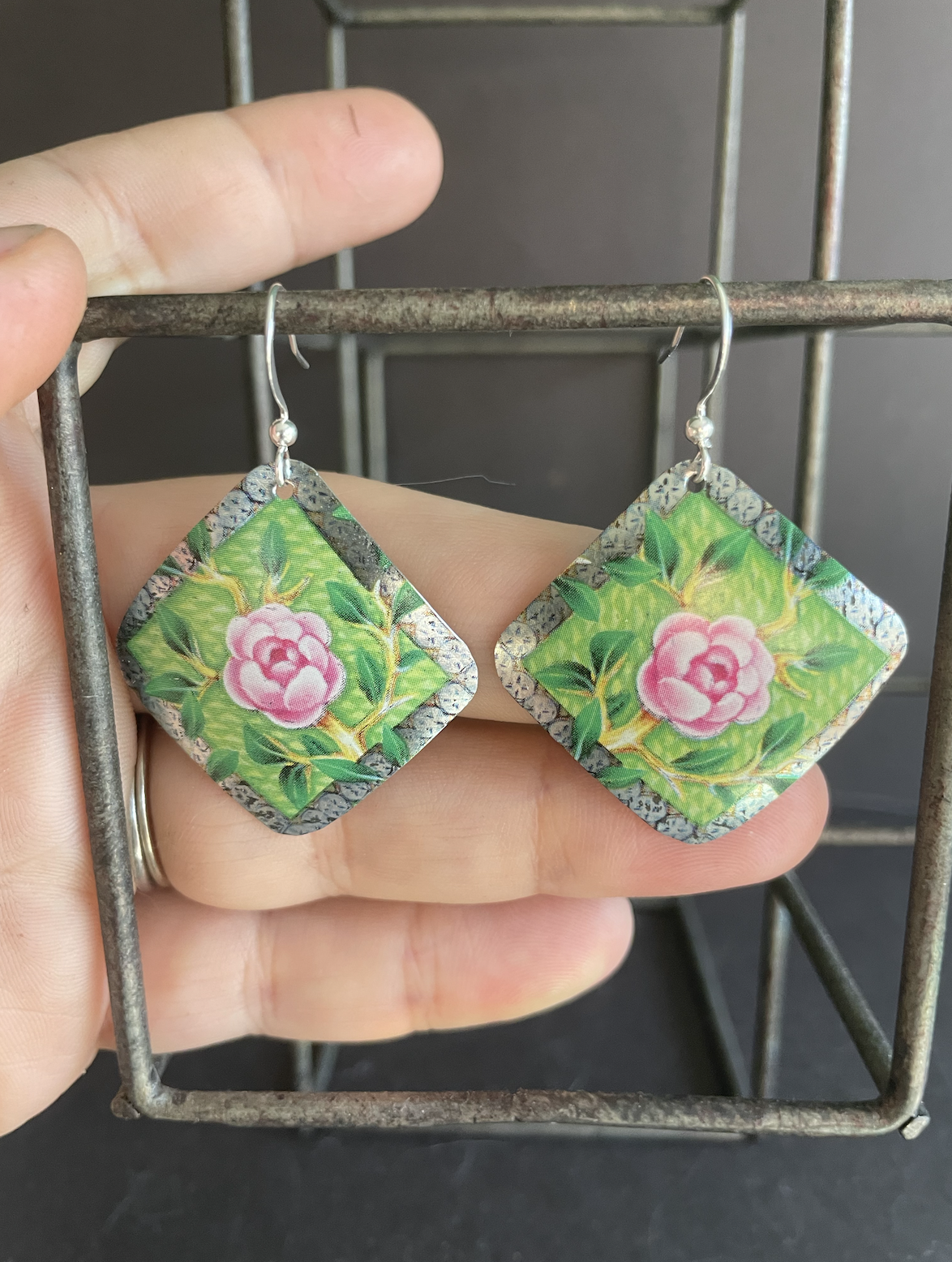 Tins are very light making them ideal for earrings as they don't weigh down your ears as the day goes on. Did you know the proper term for working with tin is "tinkering"? That made me really happy. I literally tinker in my art studio! I use old cookie tins, tea tins, and the like, break them down, and hand cut them into shapes and hand-hammer them into the 3-D shape I want them to be, finish and polish them, before putting them together like any other jewelry.