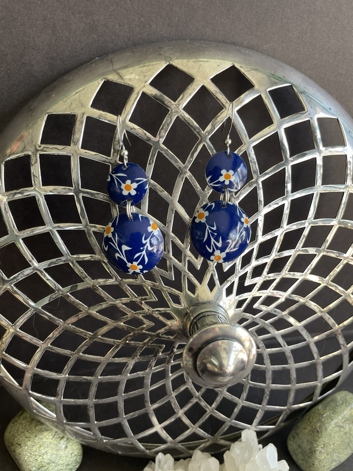 Care Instructions: As with any jewelry, the easier you treat it, the longer it will last. The double-sided pendants are not water proof. The tin earrings are water proof, although some of the older tins may rust as they have a higher iron content (I think this patina only adds to their charm).