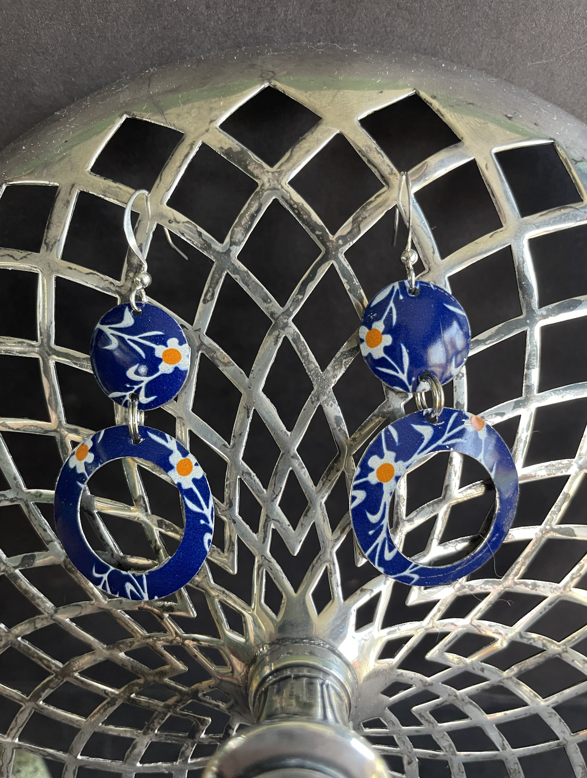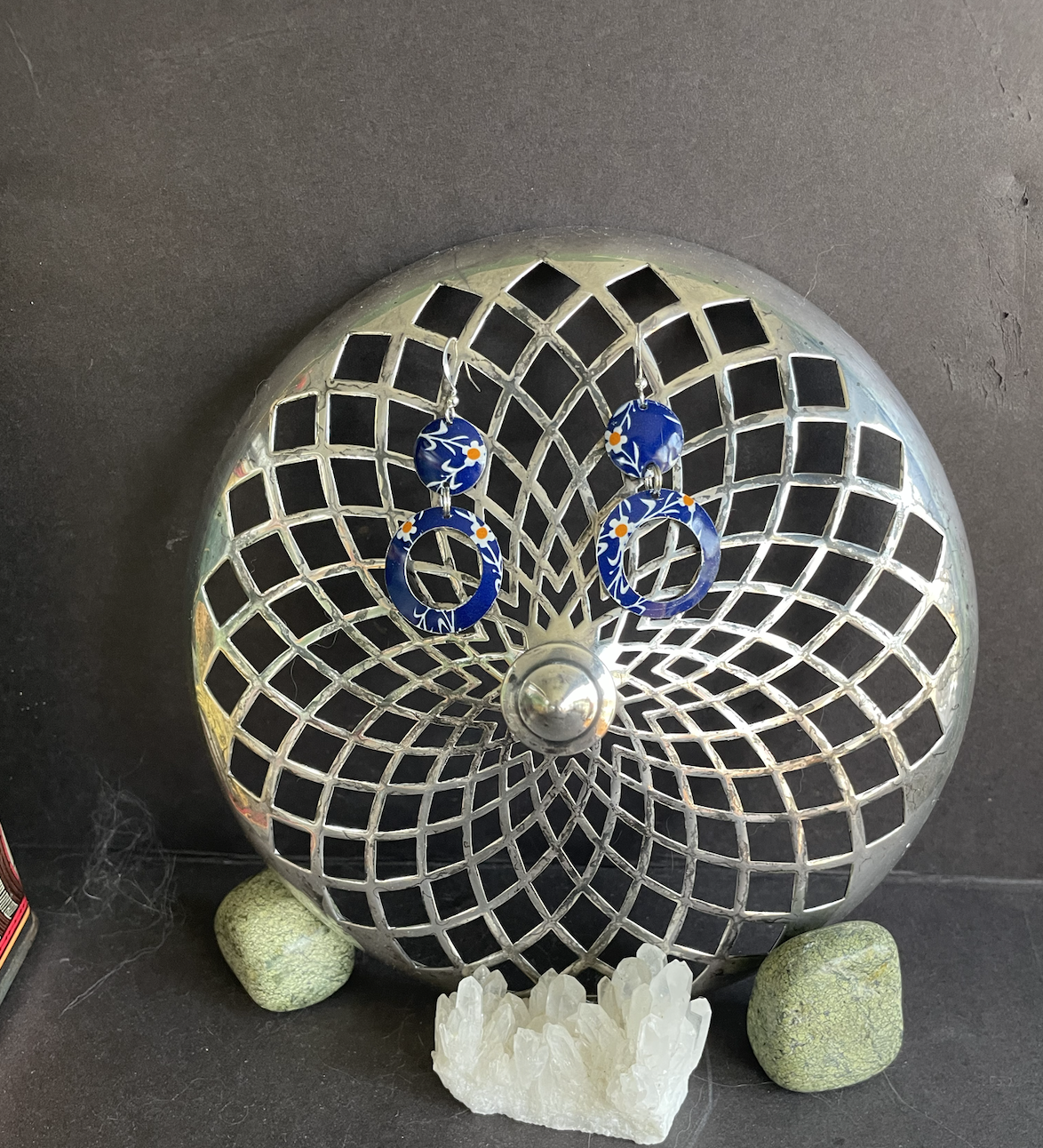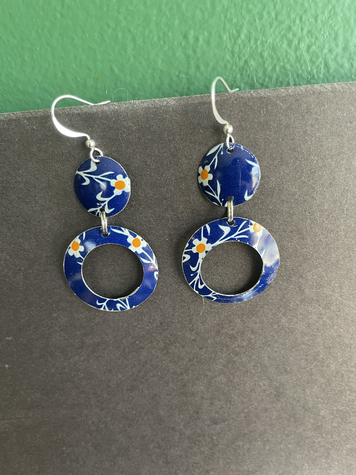 Tins are very light making them ideal for earrings as they don't weigh down your ears as the day goes on. Did you know the proper term for working with tin is "tinkering"? That made me really happy. I literally tinker in my art studio! I use old cookie tins, tea tins, and the like, break them down, and hand cut them into shapes and hand-hammer them into the 3-D shape I want them to be, finish and polish them, before putting them together like any other jewelry.