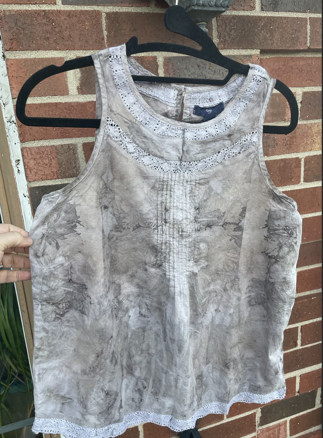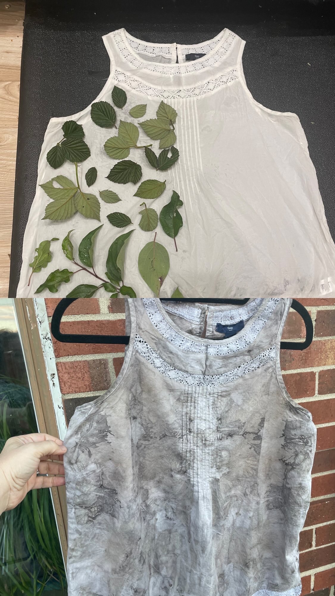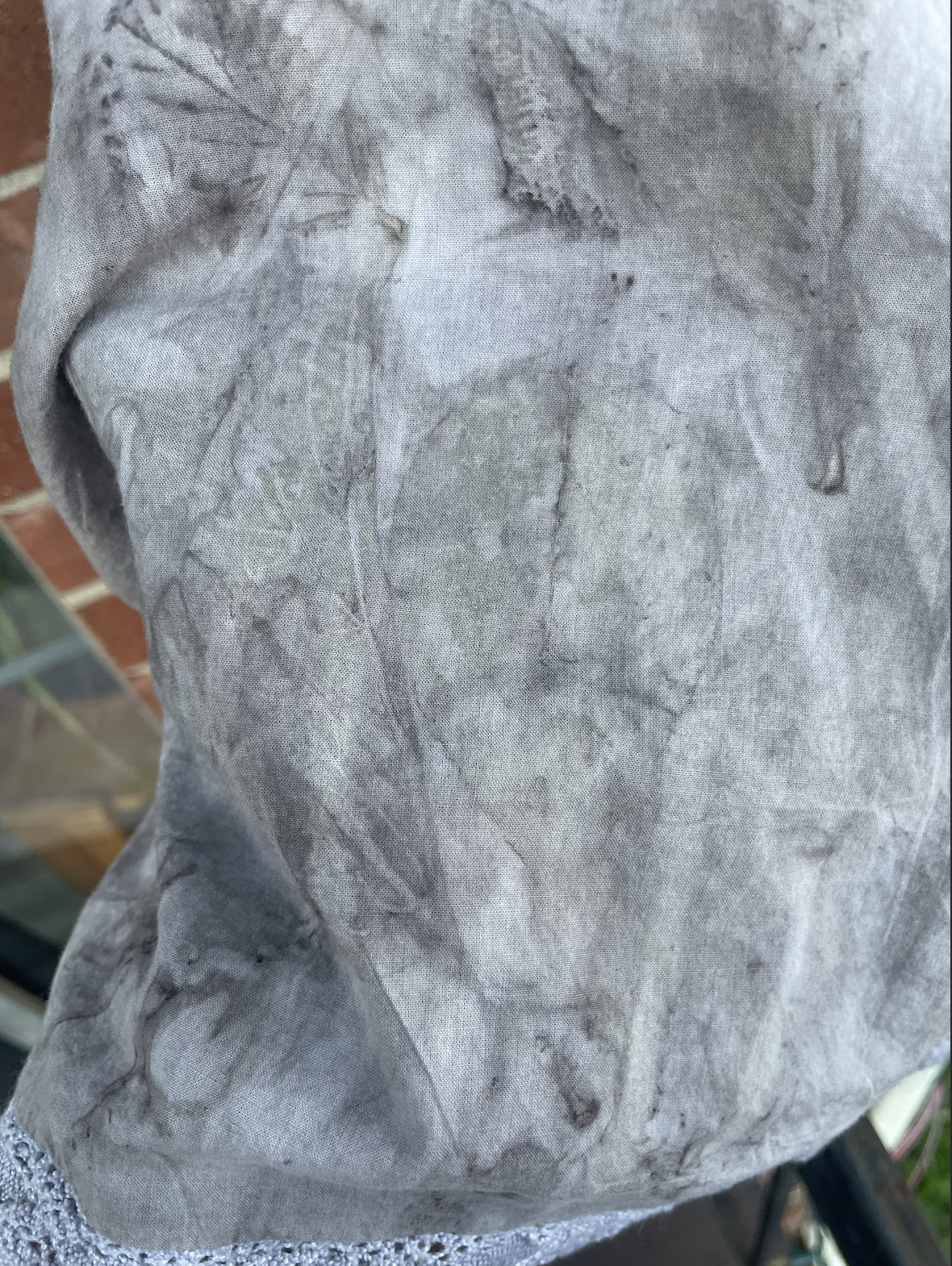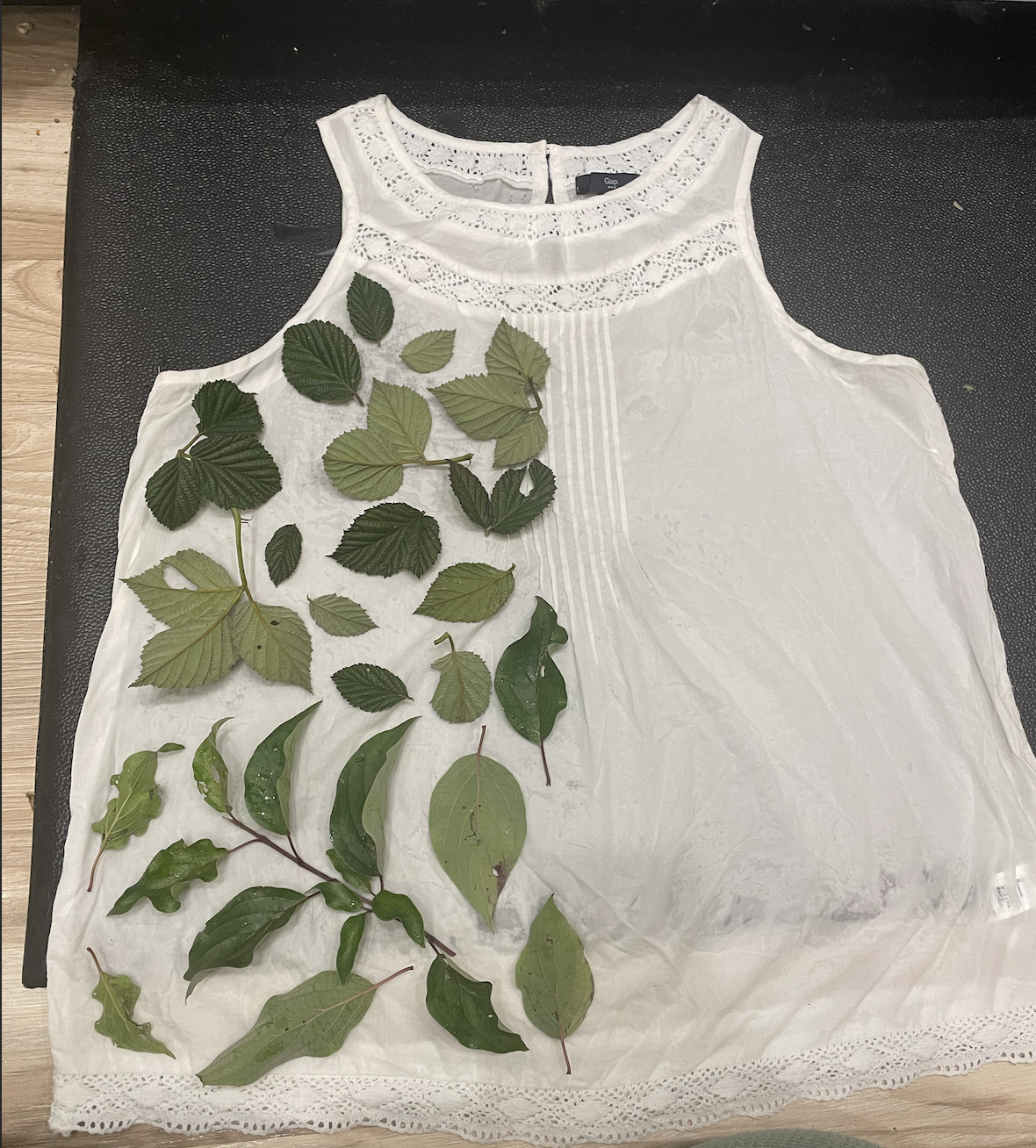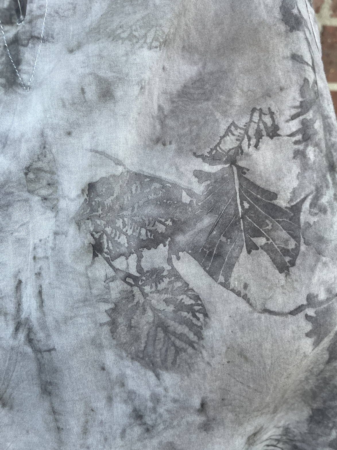 Eco-printing is a process of pressing the entire dye plant against the fabric and transferring the color while the plant stays flat, without the use of chemical mordants.