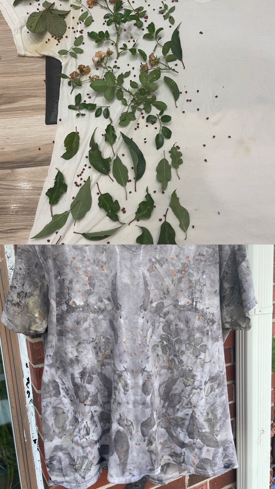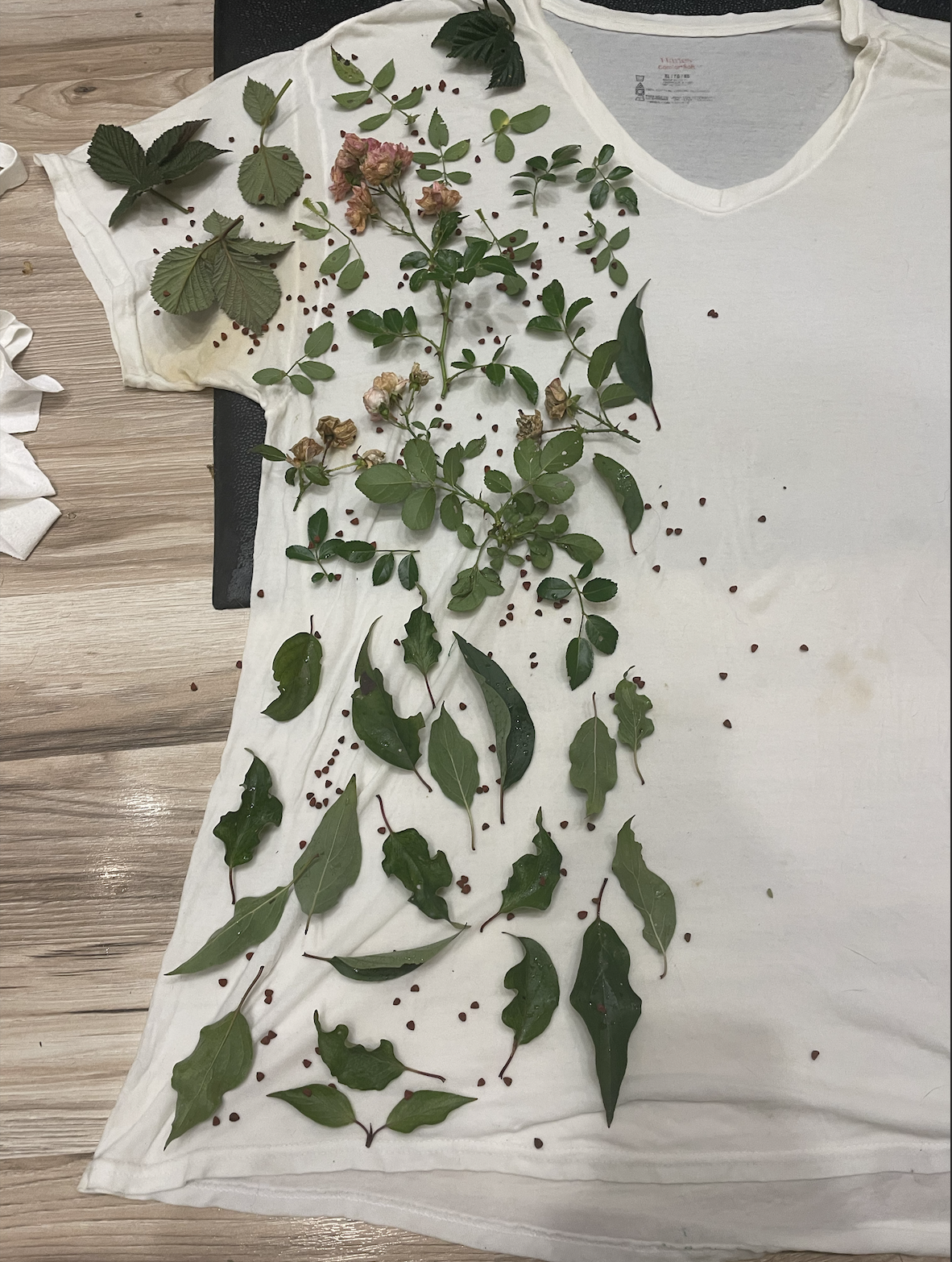Eco-printing is a process of pressing the entire dye plant against the fabric and transferring the color while the plant stays flat, without the use of chemical mordants.