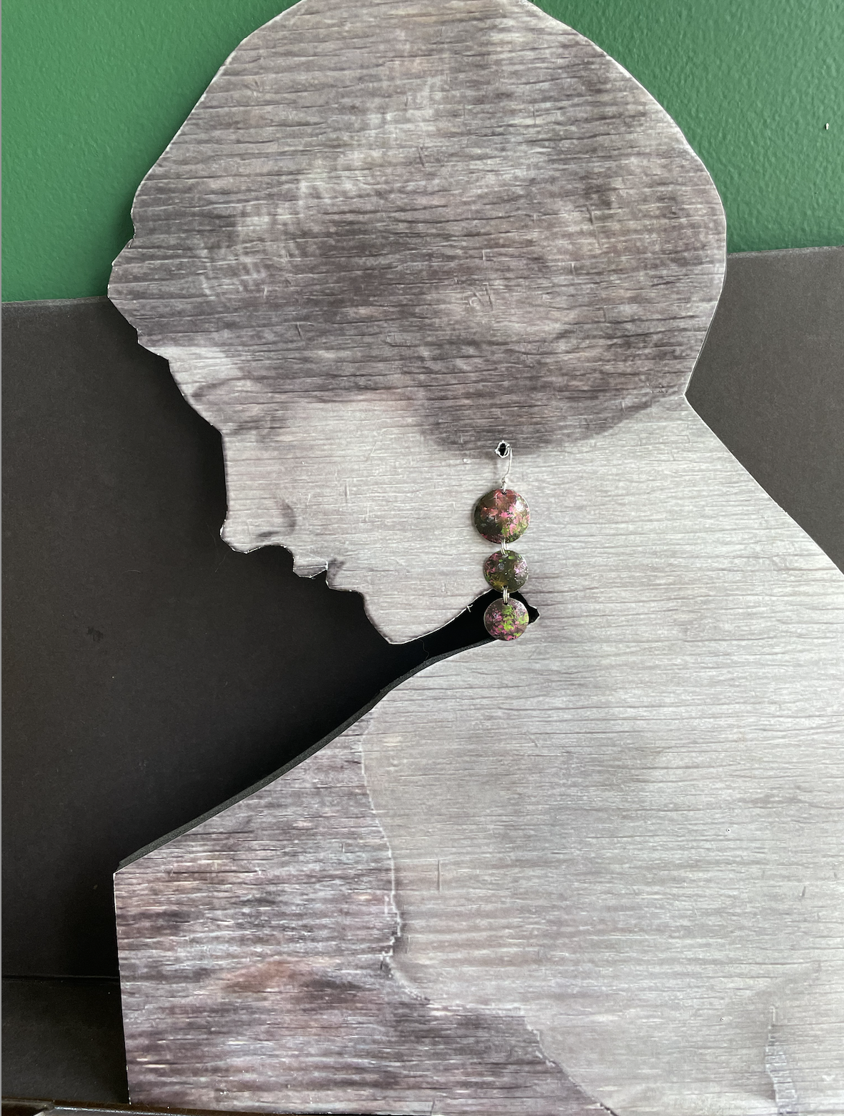 This popcorn tin showcased a quaint cafe and flower market scene in Paris. So quaint I named this collection "Gay Paris" (pronounced 'paree'). I love how the close-ups of so many of these bits create colorful abstract earrings, like these floral triple drops. These silver plated earrings come with a rubber stopper so they won't fall out of your ears.