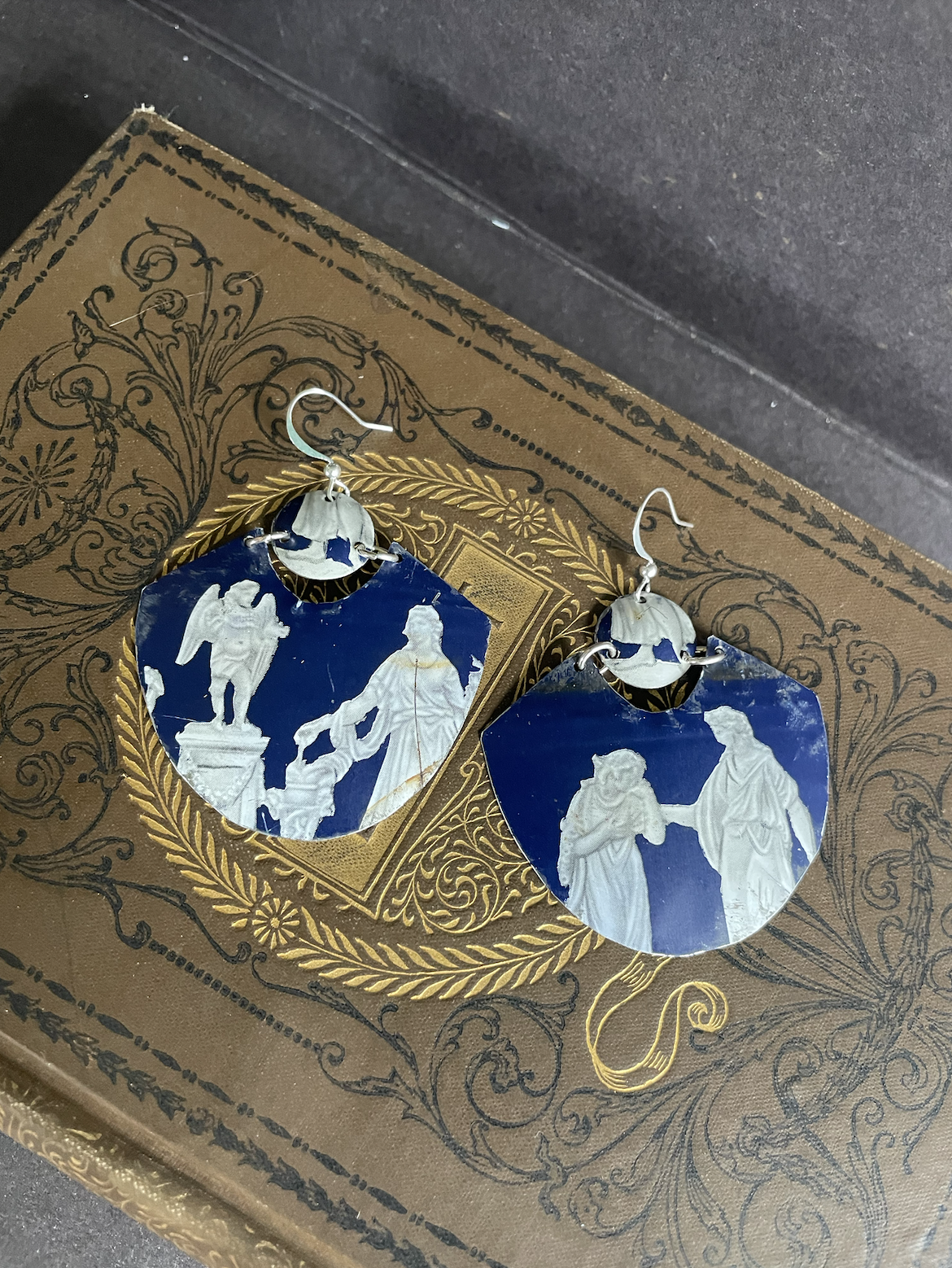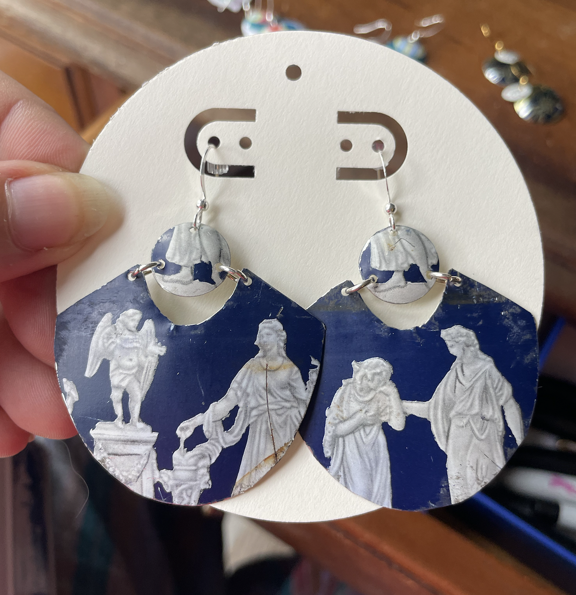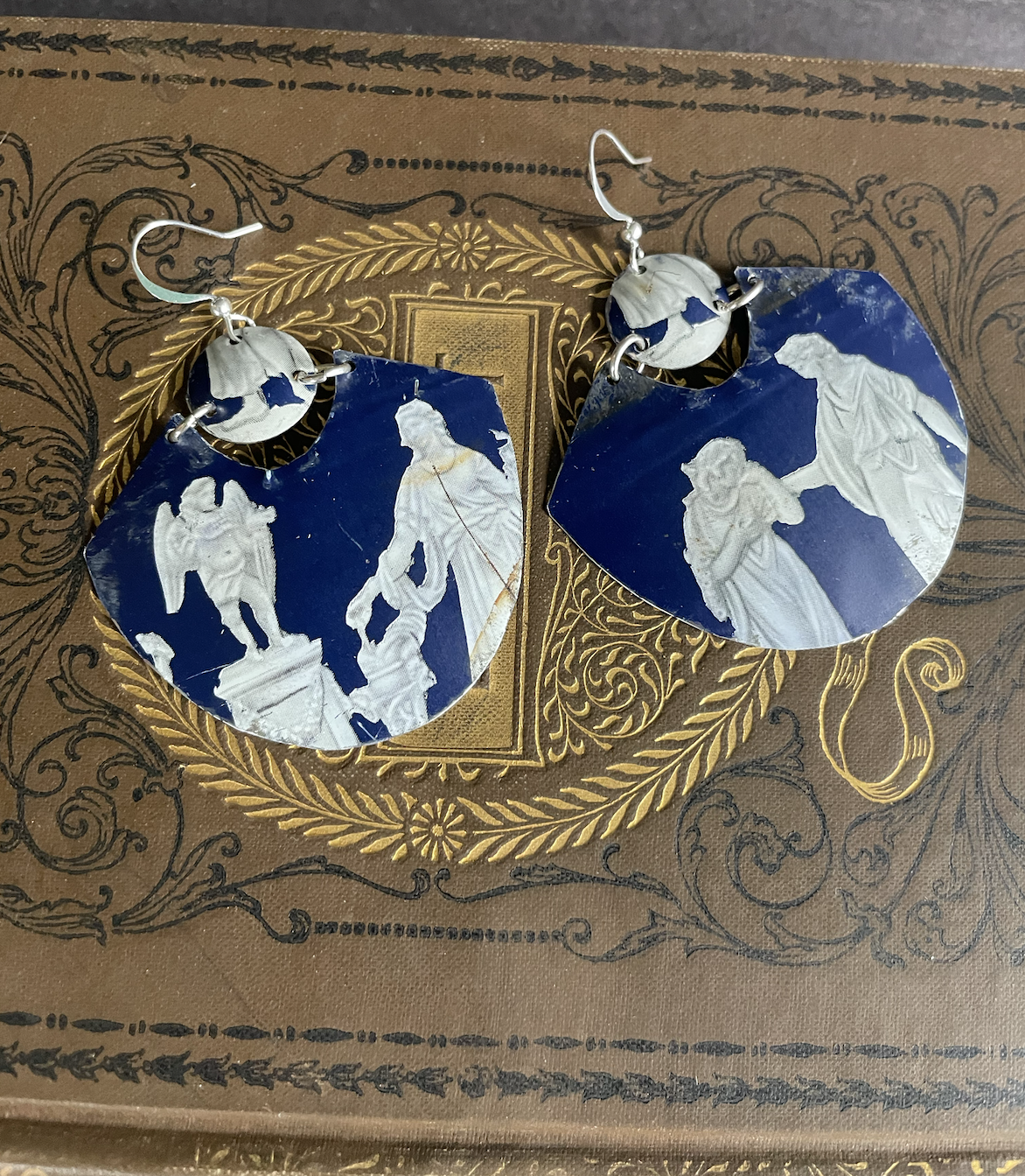 Nothing hits like the classics. And I'm referring, of course, to the ancient classical aspect of "classics." There are a few funny things happening. Can you find them all? The small dings in color of the tin are due to the antique (used) nature of the tin I used to make this jewelry. These silver-plated earrings have rubber stoppers on the back so they won't fall out of your ears.