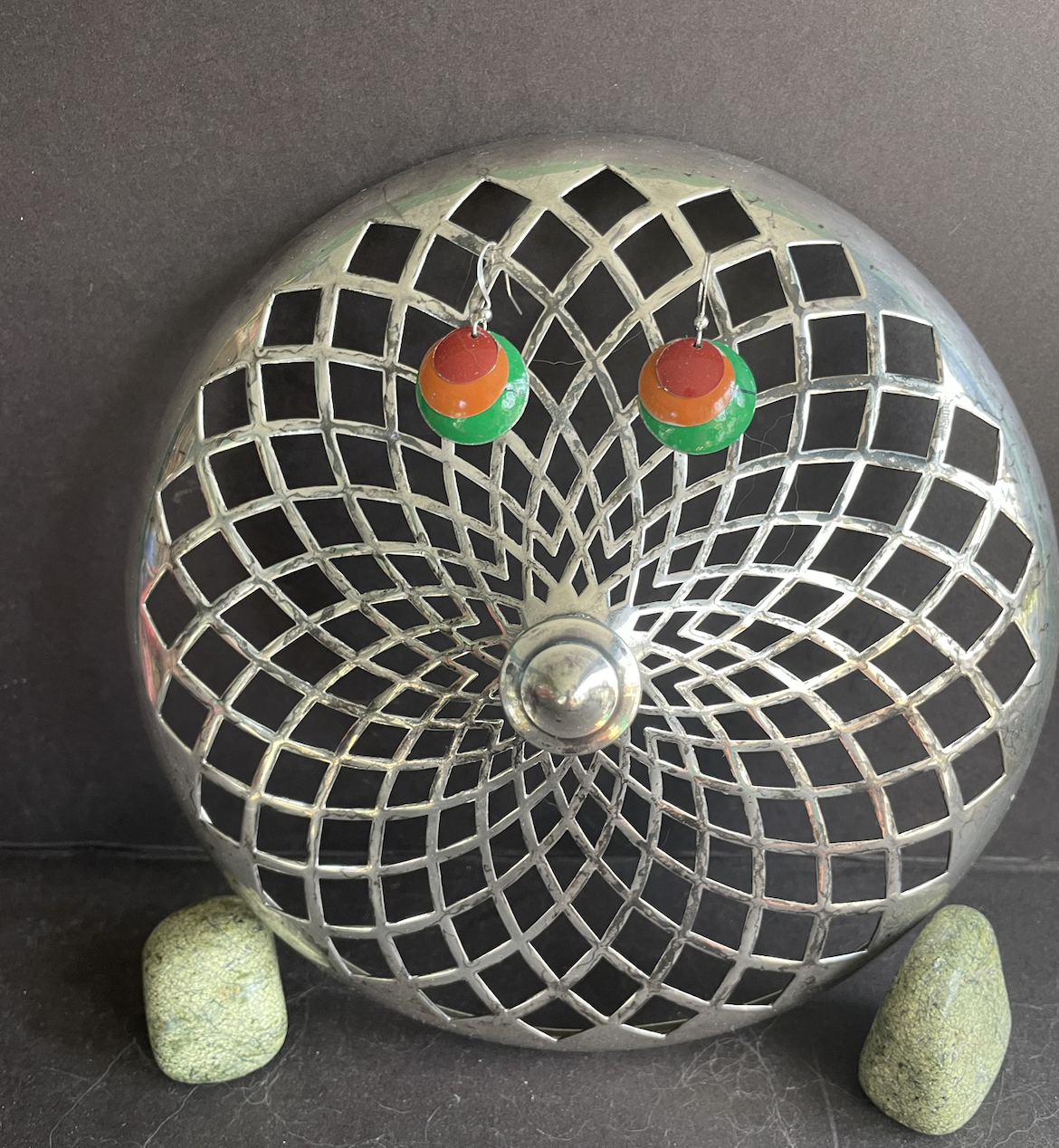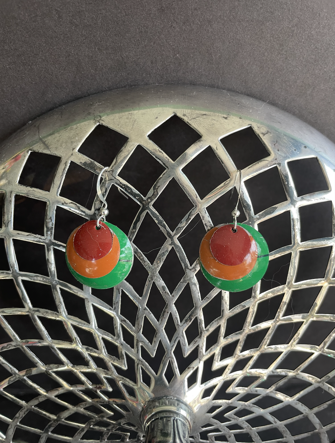 These simple rust-colored and green earrings are perfect for the earth lover. The earring findings are silver-plated and have no nickel. They come with rubber stoppers so they won't fall out of your ears.