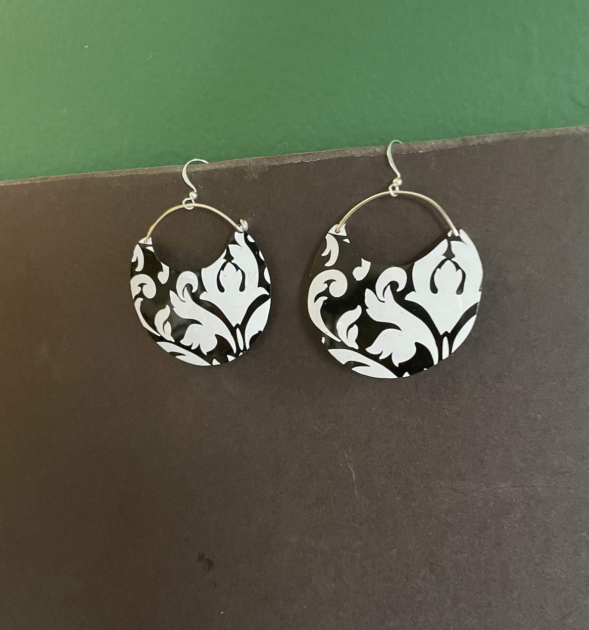 Tins are very light making them ideal for earrings as they don't weigh down your ears as the day goes on. Did you know the proper term for working with tin is "tinkering"? That made me really happy. I literally tinker in my art studio! I use old cookie tins, tea tins, and the like, break them down, and hand cut them into shapes and hand-hammer them into the 3-D shape I want them to be, finish and polish them, before putting them together like any other jewelry.