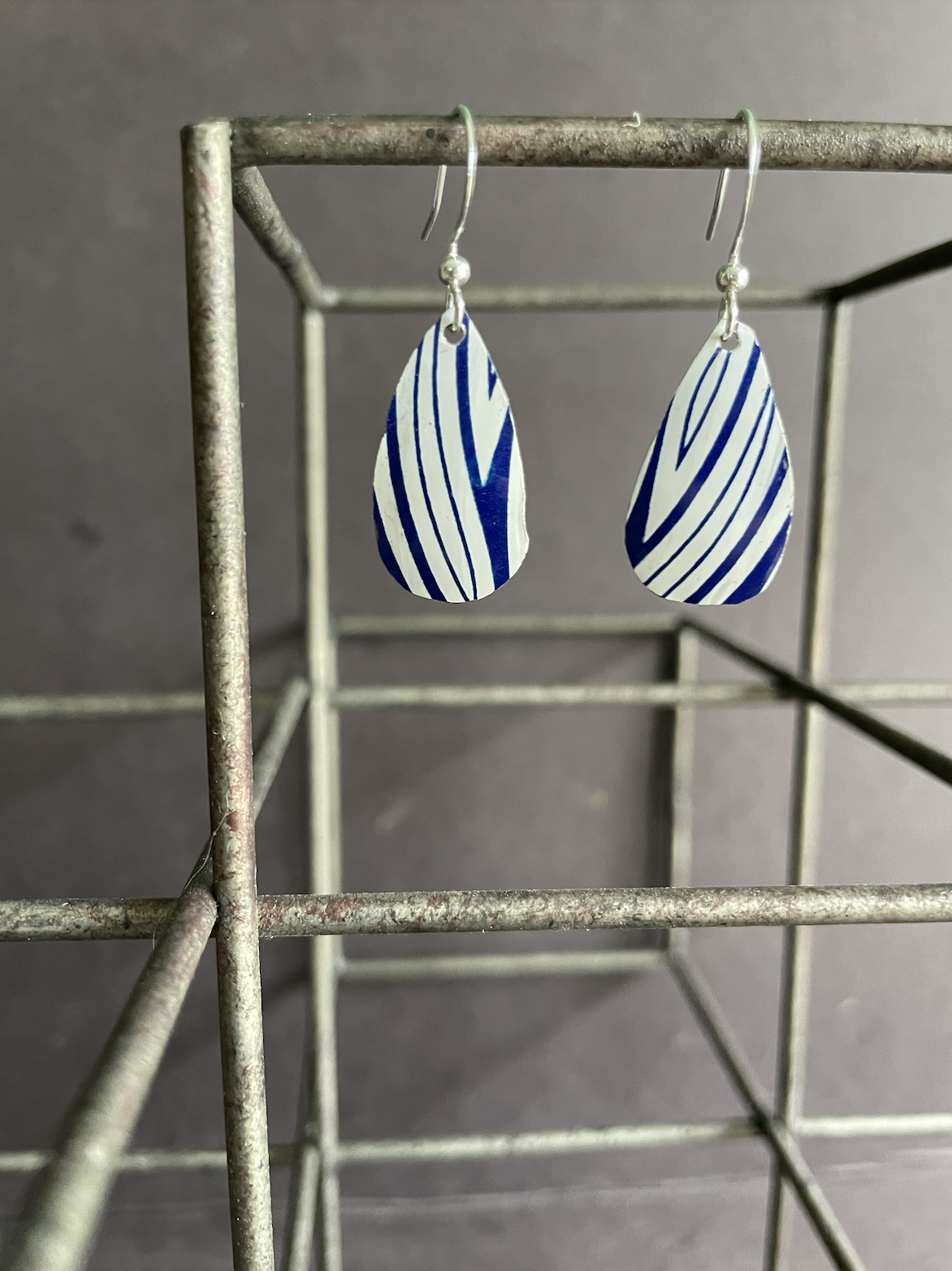 Tins are very light making them ideal for earrings as they don't weigh down your ears as the day goes on. Did you know the proper term for working with tin is "tinkering"? That made me really happy. I literally tinker in my art studio! I use old cookie tins, tea tins, and the like, break them down, and hand cut them into shapes and hand-hammer them into the 3-D shape I want them to be, finish and polish them, before putting them together like any other jewelry.