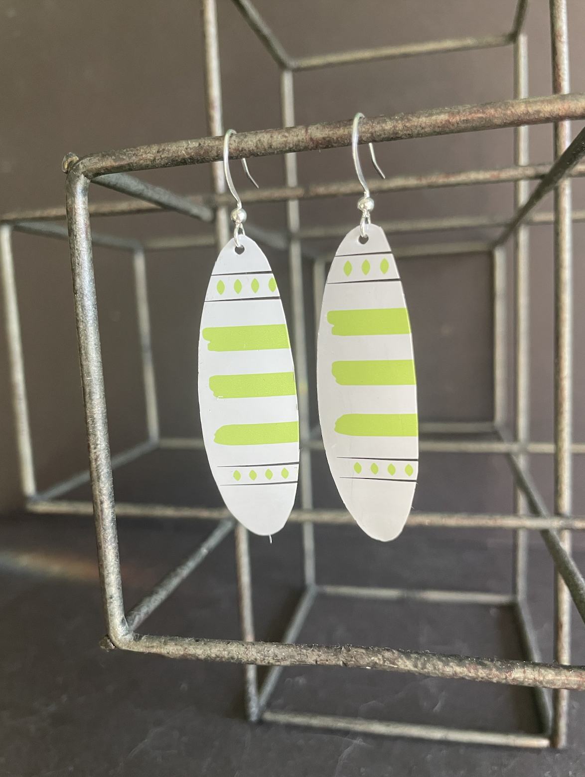 Tins are very light making them ideal for earrings as they don't weigh down your ears as the day goes on. Did you know the proper term for working with tin is "tinkering"? That made me really happy. I literally tinker in my art studio! I use old cookie tins, tea tins, and the like, break them down, and hand cut them into shapes and hand-hammer them into the 3-D shape I want them to be, finish and polish them, before putting them together like any other jewelry.