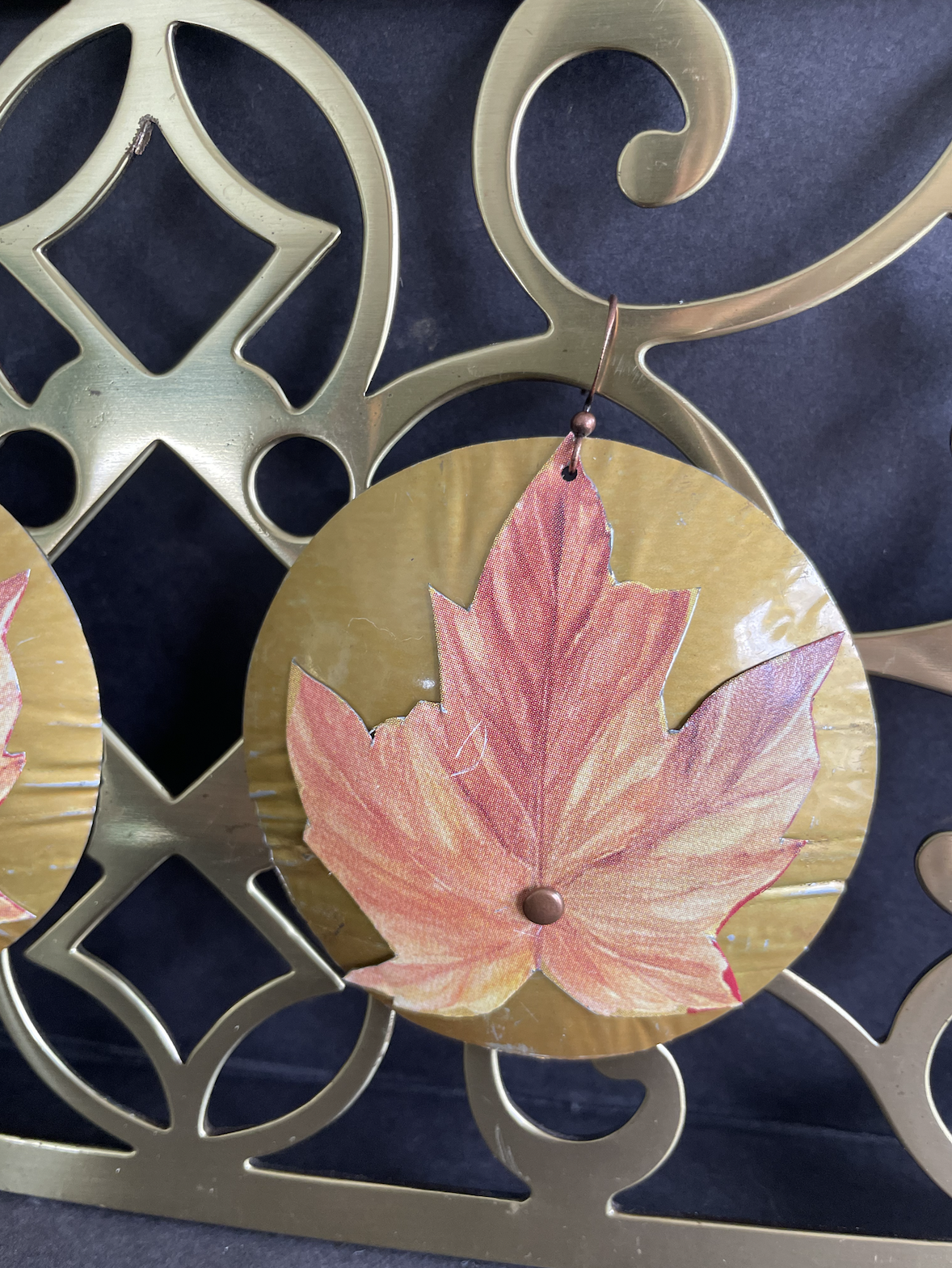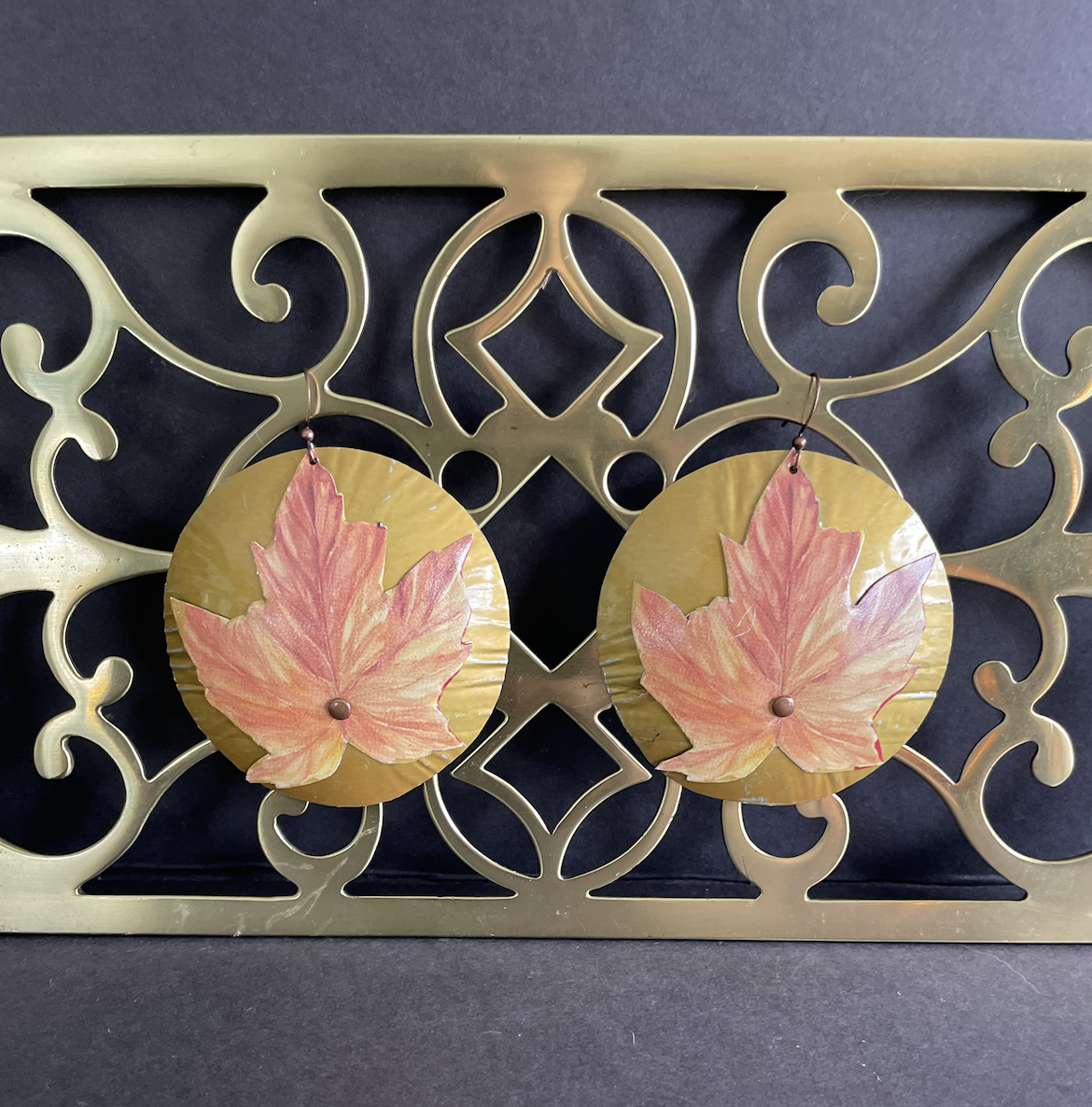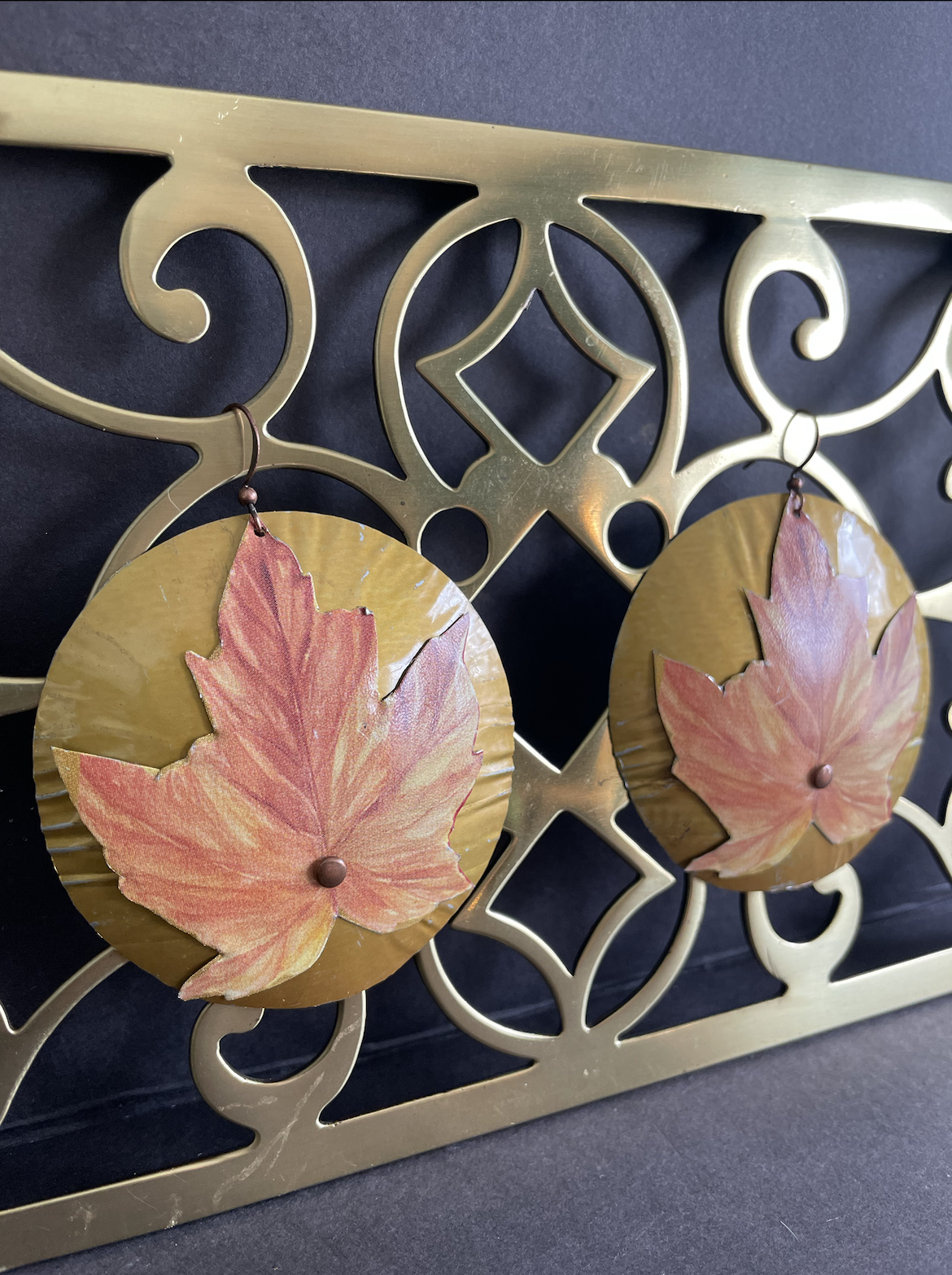 The ultimate autumnal flare. The earrings and rivets are copper. These have little rubber stoppers on the back so they won't fall out of your ears.