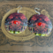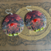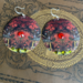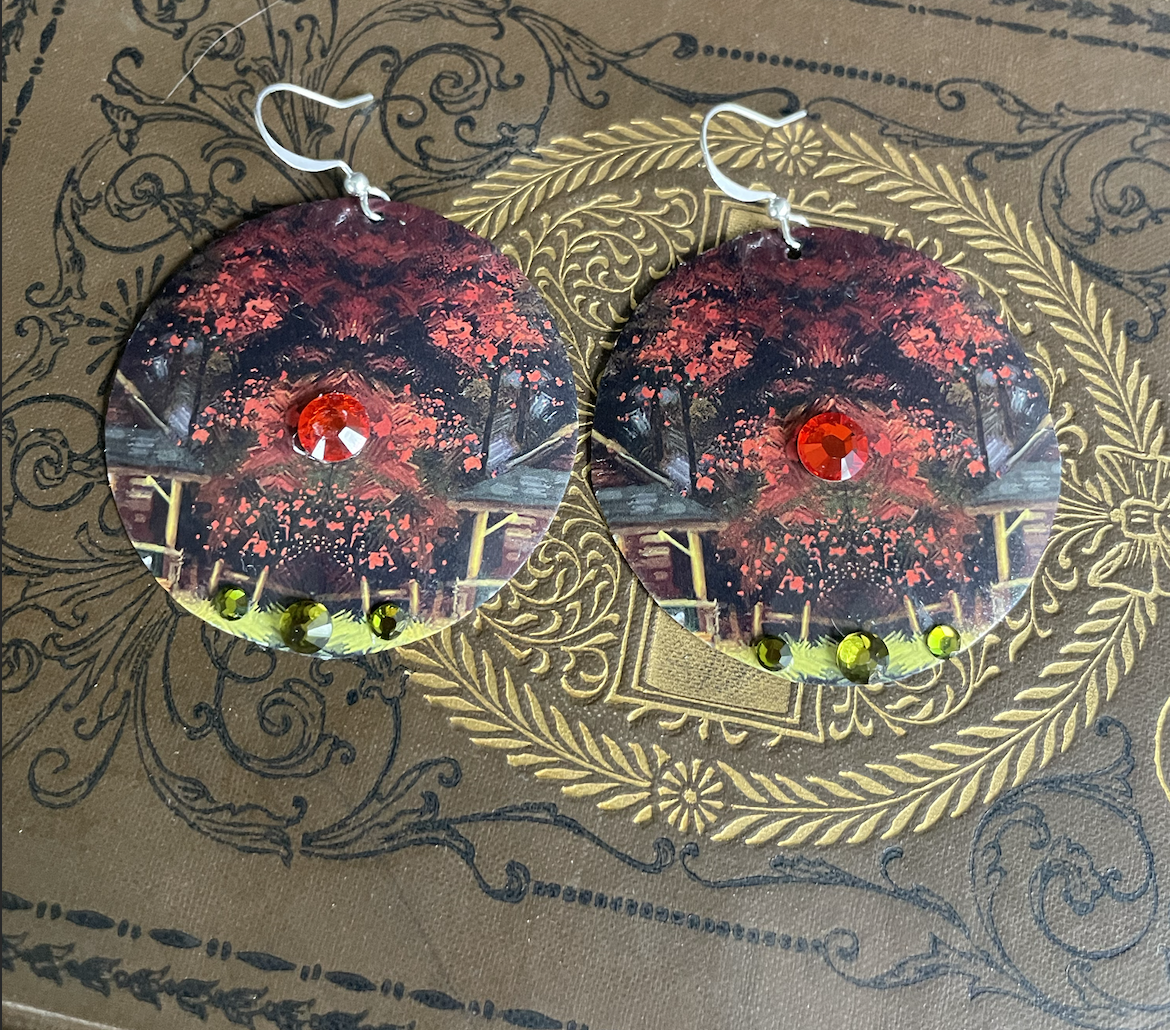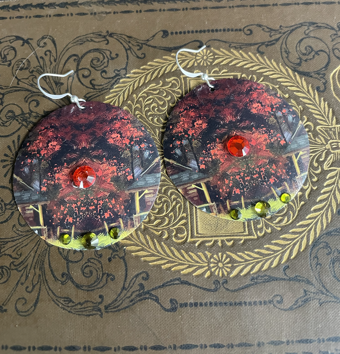 Originally a popcorn tin, the imagery created this fascinating mirror image when the wrap-around image ended. I loved the colors and patterns these maple trees made, and chose to highlight them with rhinestones. The findings are silver plated and have a rubber stopper on the back so they won't fall out of your ears.