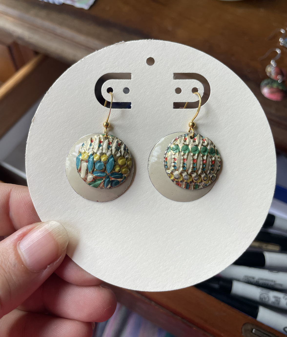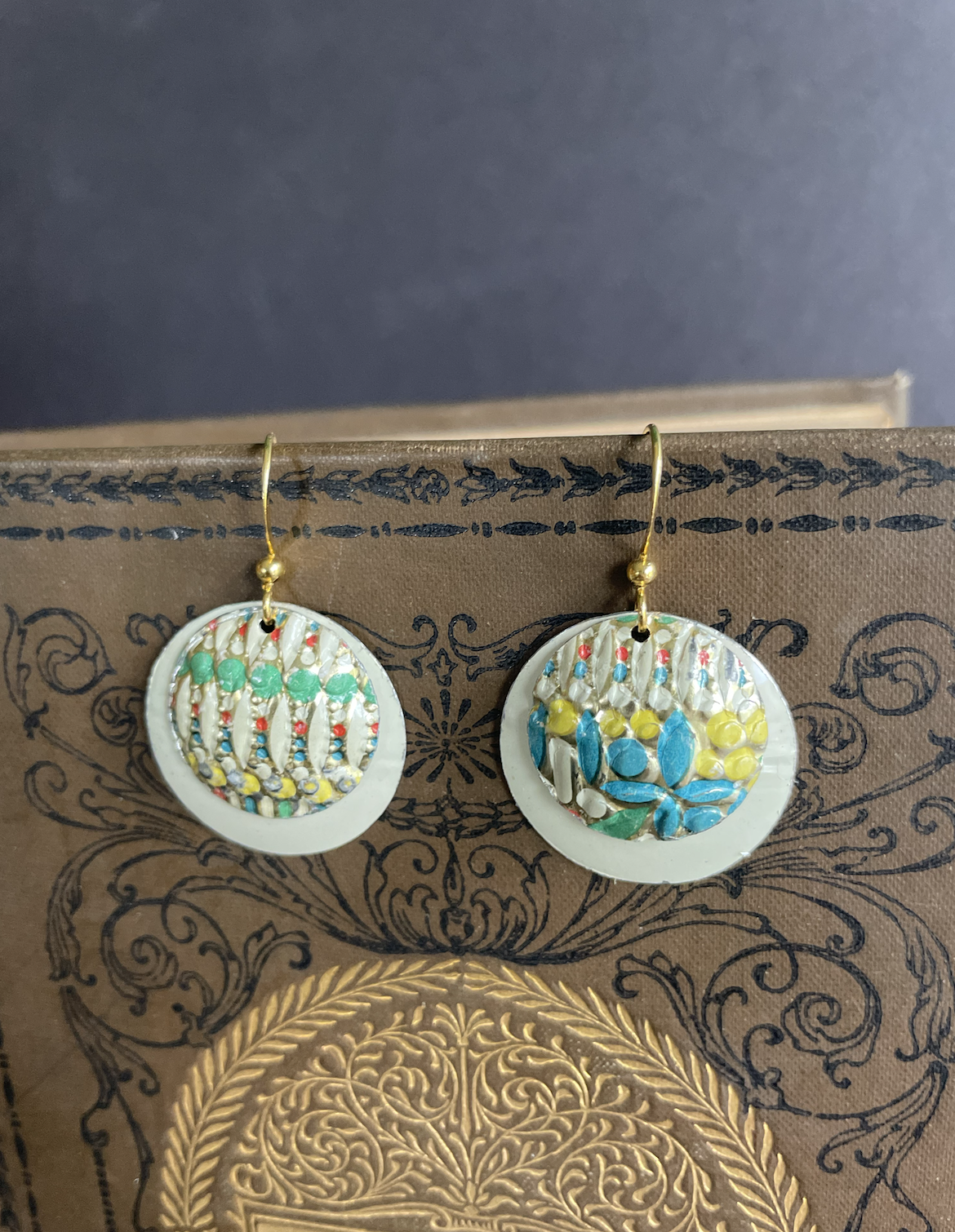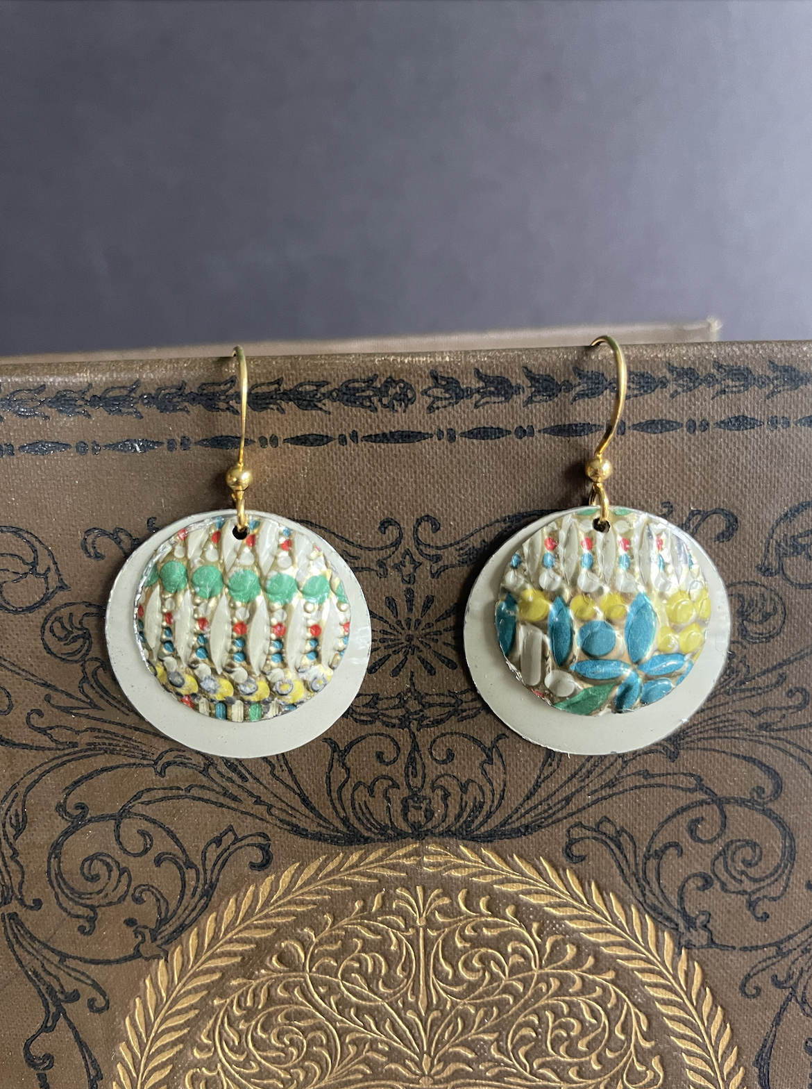 Tins are very light making them ideal for earrings as they don't weigh down your ears as the day goes on. Did you know the proper term for working with tin is "tinkering"? That made me really happy. I literally tinker in my art studio! I use old cookie tins, tea tins, and the like, break them down, and hand cut them into shapes and hand-hammer them into the 3-D shape I want them to be, finish and polish them, before putting them together like any other jewelry.
