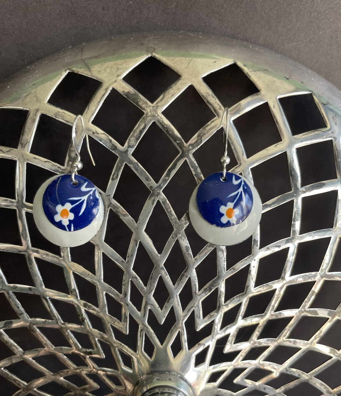 Tins are very light making them ideal for earrings as they don't weigh down your ears as the day goes on. Did you know the proper term for working with tin is "tinkering"? That made me really happy. I literally tinker in my art studio! I use old cookie tins, tea tins, and the like, break them down, and hand cut them into shapes and hand-hammer them into the 3-D shape I want them to be, finish and polish them, before putting them together like any other jewelry.