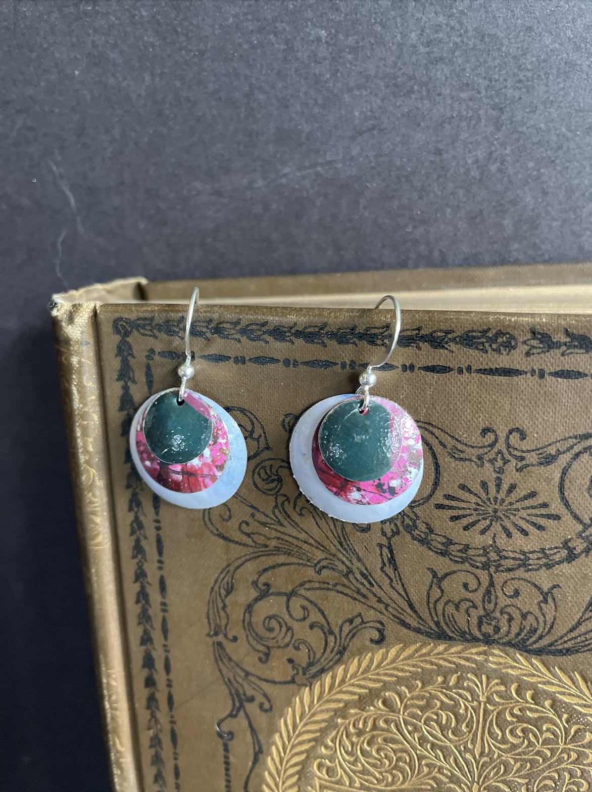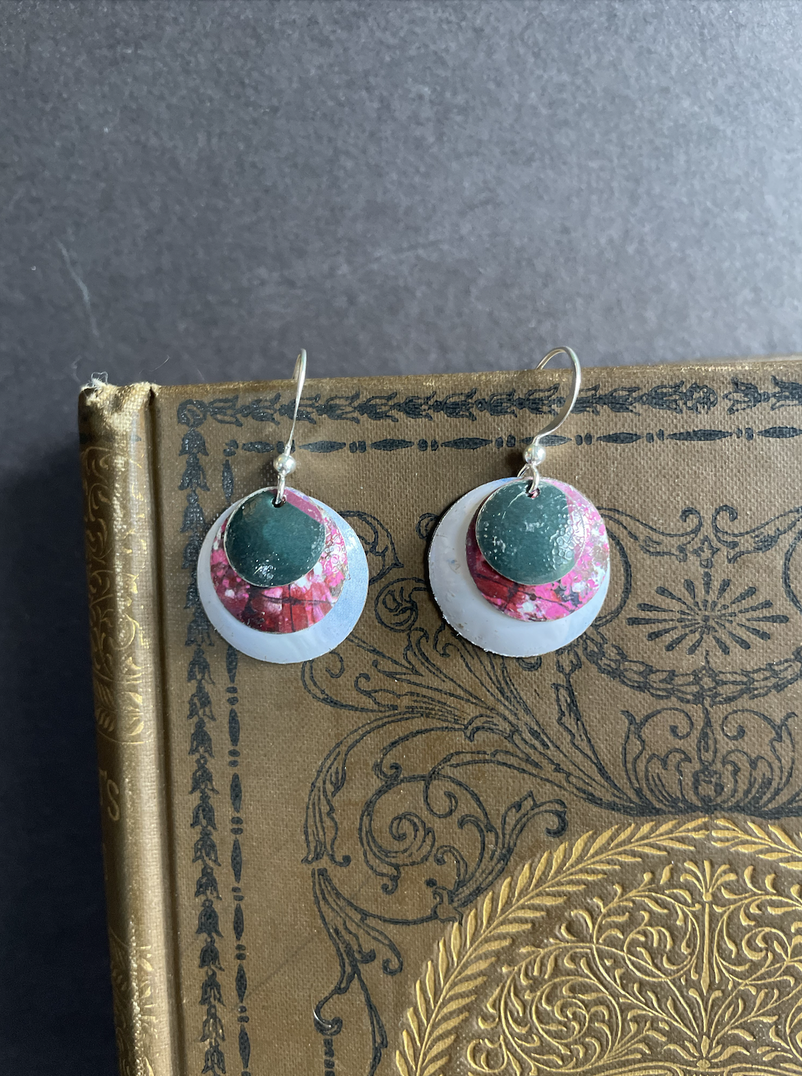 Tins are very light making them ideal for earrings as they don't weigh down your ears as the day goes on. Did you know the proper term for working with tin is "tinkering"? That made me really happy. I literally tinker in my art studio! I use old cookie tins, tea tins, and the like, break them down, and hand cut them into shapes and hand-hammer them into the 3-D shape I want them to be, finish and polish them, before putting them together like any other jewelry.