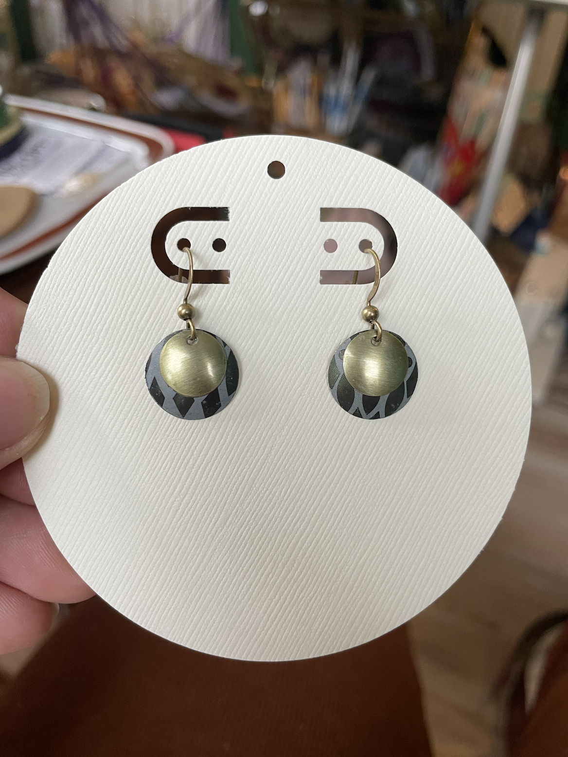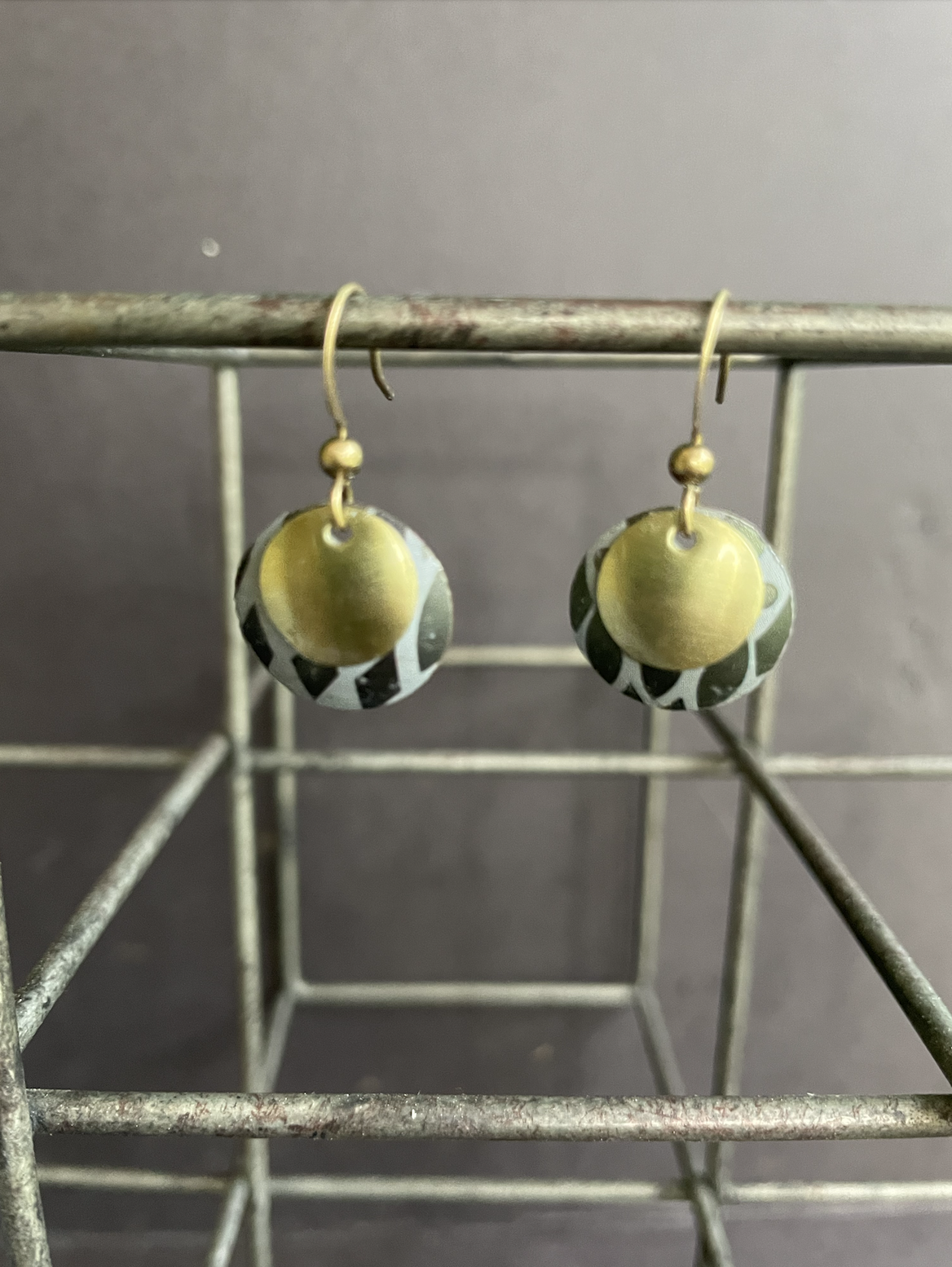 Tins are very light making them ideal for earrings as they don't weigh down your ears as the day goes on. Did you know the proper term for working with tin is "tinkering"? That made me really happy. I literally tinker in my art studio! I use old cookie tins, tea tins, and the like, break them down, and hand cut them into shapes and hand-hammer them into the 3-D shape I want them to be, finish and polish them, before putting them together like any other jewelry.