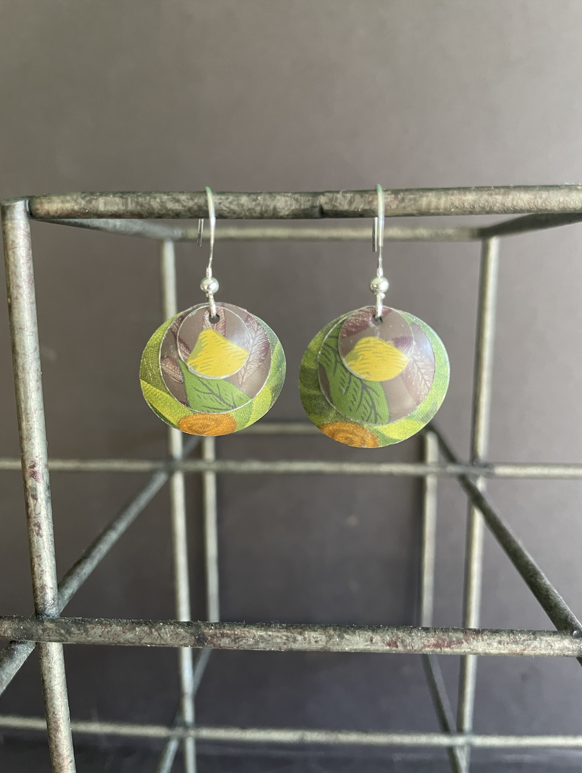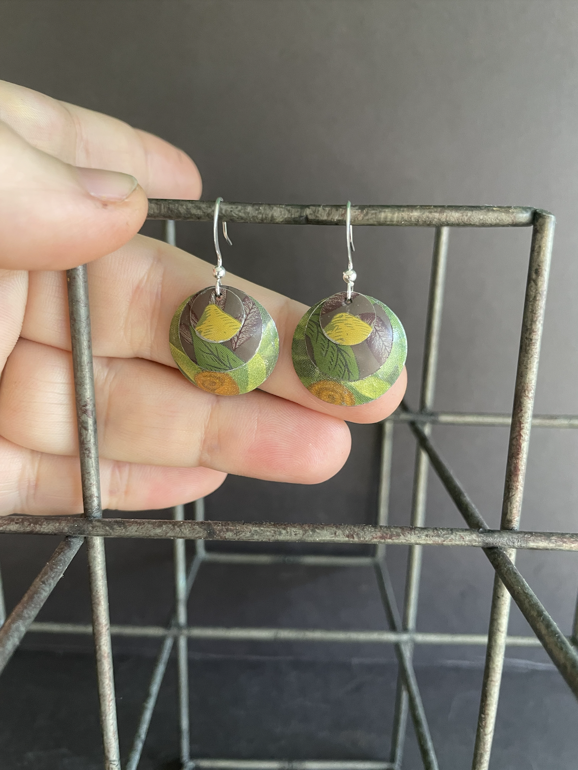 Tins are very light making them ideal for earrings as they don't weigh down your ears as the day goes on. Did you know the proper term for working with tin is "tinkering"? That made me really happy. I literally tinker in my art studio! I use old cookie tins, tea tins, and the like, break them down, and hand cut them into shapes and hand-hammer them into the 3-D shape I want them to be, finish and polish them, before putting them together like any other jewelry.