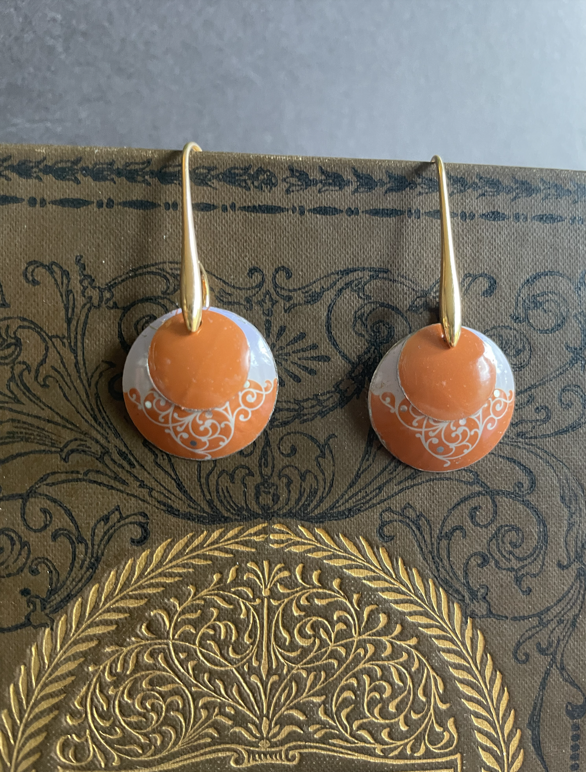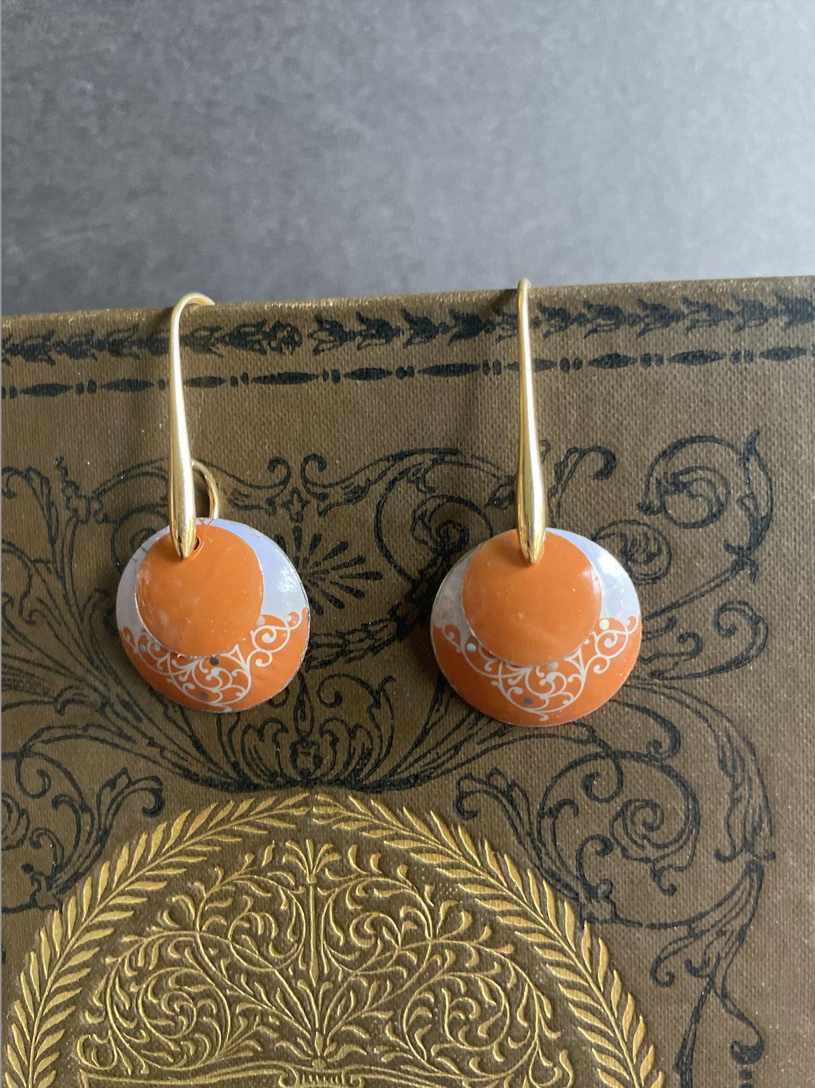Gorgeous, simple, bright. These nested circles come from a tea tin of Haney & Sons Tea. The earring findings are gold plated and have no nickel.