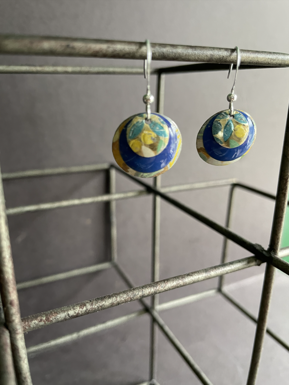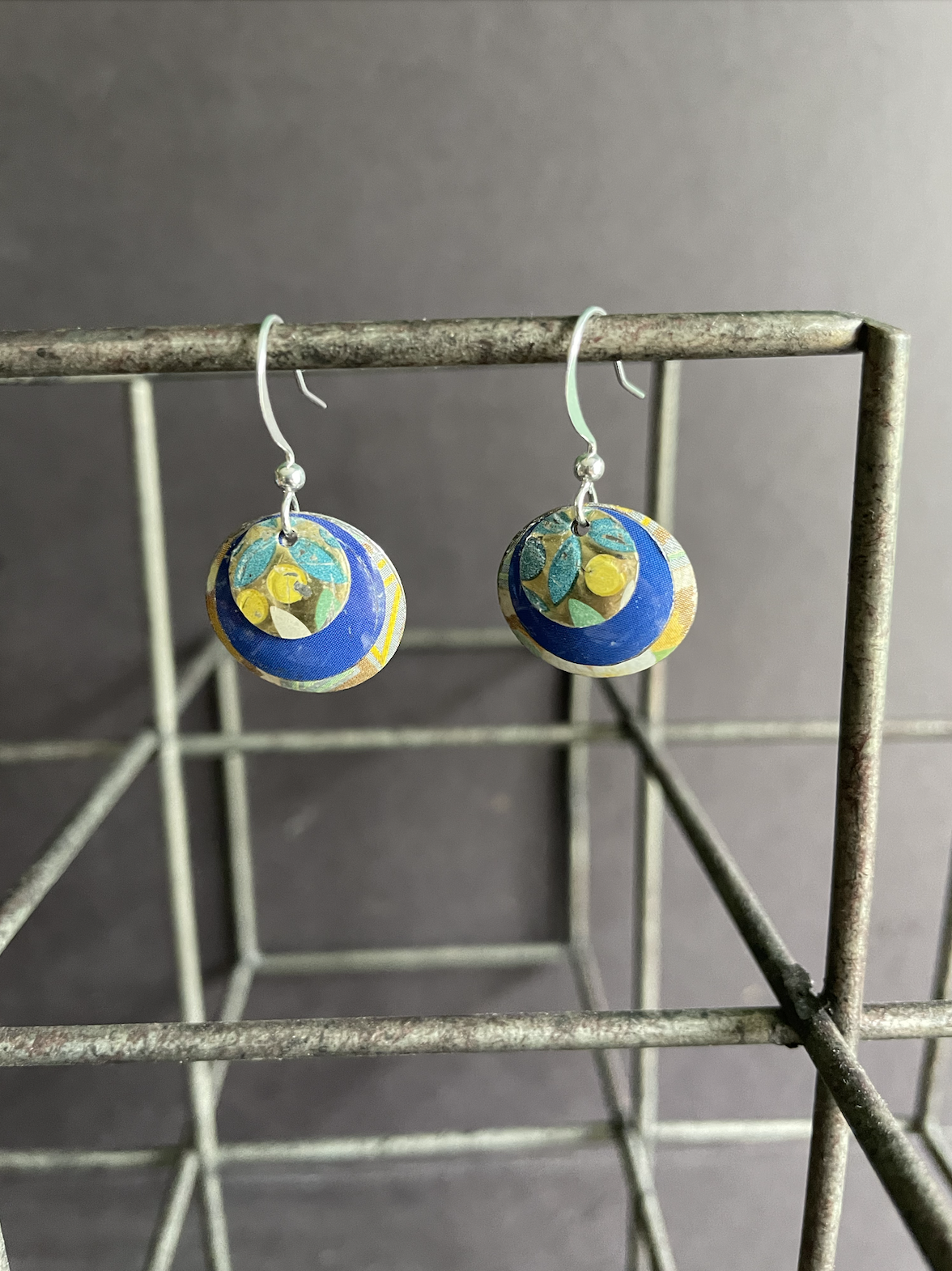 Tins are very light making them ideal for earrings as they don't weigh down your ears as the day goes on. Did you know the proper term for working with tin is "tinkering"? That made me really happy. I literally tinker in my art studio! I use old cookie tins, tea tins, and the like, break them down, and hand cut them into shapes and hand-hammer them into the 3-D shape I want them to be, finish and polish them, before putting them together like any other jewelry.