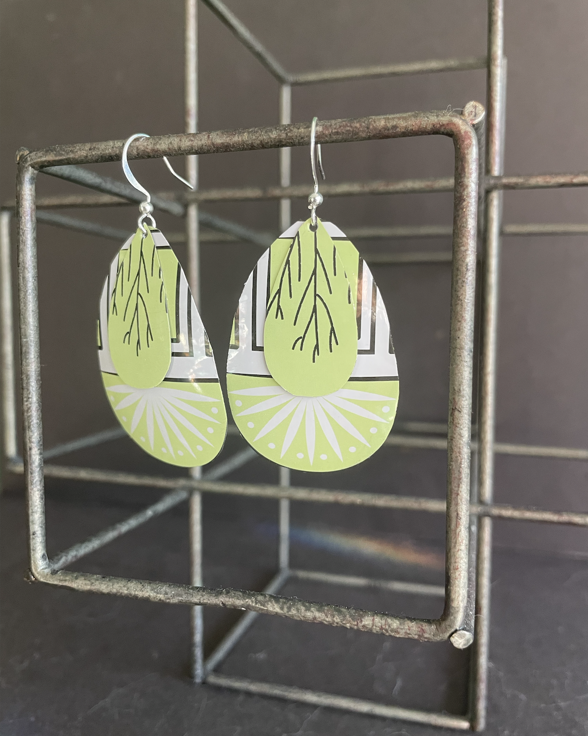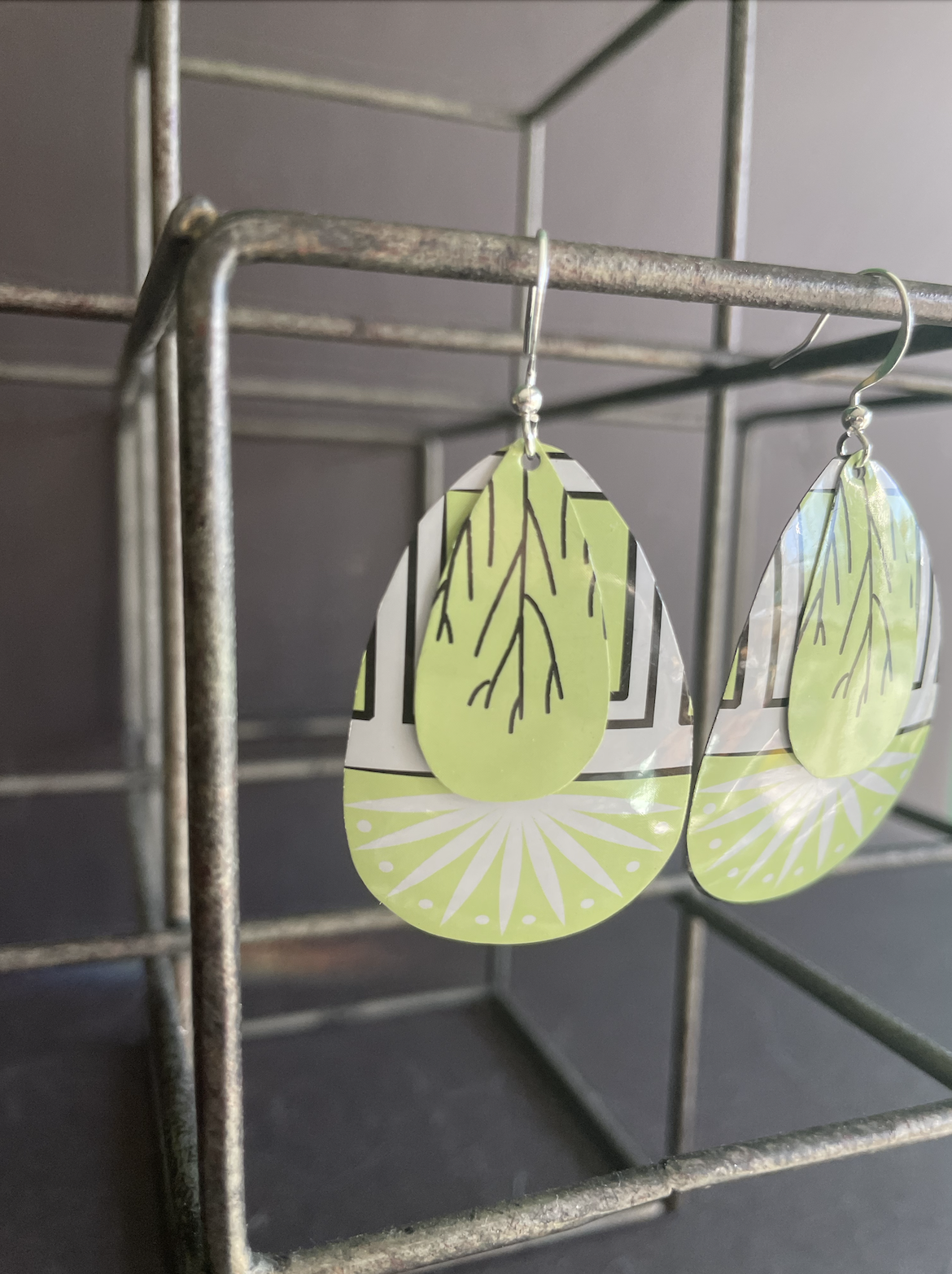 Tins are very light making them ideal for earrings as they don't weigh down your ears as the day goes on. Did you know the proper term for working with tin is "tinkering"? That made me really happy. I literally tinker in my art studio! I use old cookie tins, tea tins, and the like, break them down, and hand cut them into shapes and hand-hammer them into the 3-D shape I want them to be, finish and polish them, before putting them together like any other jewelry.