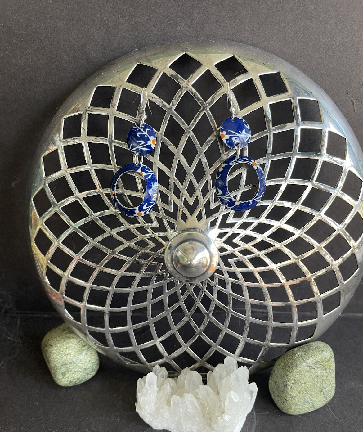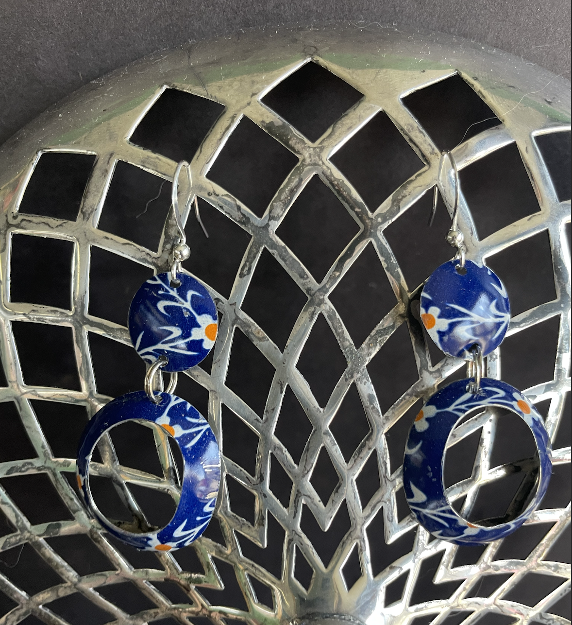 Tins are very light making them ideal for earrings as they don't weigh down your ears as the day goes on. Did you know the proper term for working with tin is "tinkering"? That made me really happy. I literally tinker in my art studio! I use old cookie tins, tea tins, and the like, break them down, and hand cut them into shapes and hand-hammer them into the 3-D shape I want them to be, finish and polish them, before putting them together like any other jewelry.