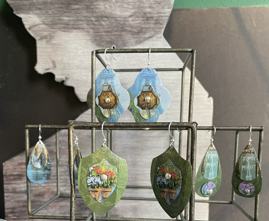 This popcorn tin showcased a quaint cafe and flower market scene in Paris. So quaint I named this collection "Gay Paris" (pronounced 'paree'). I love how the close-ups of so many of these bits create colorful abstract earrings, like these pots in the rain earrings. These silver plated earrings come with a rubber stopper so they won't fall out of your ears.