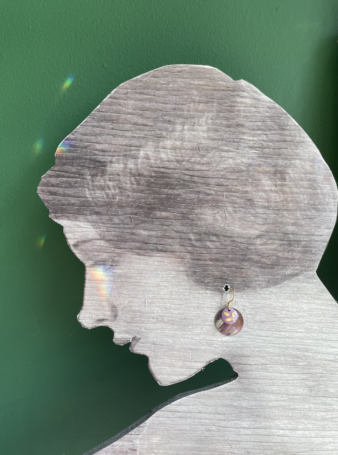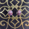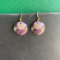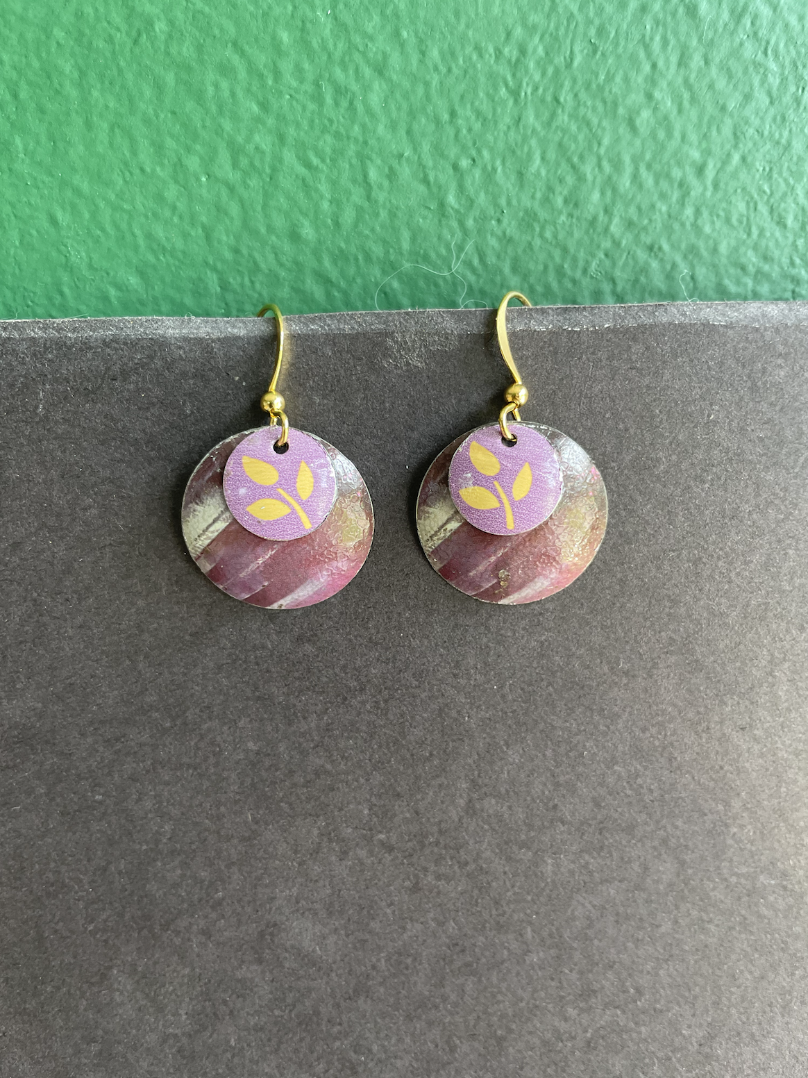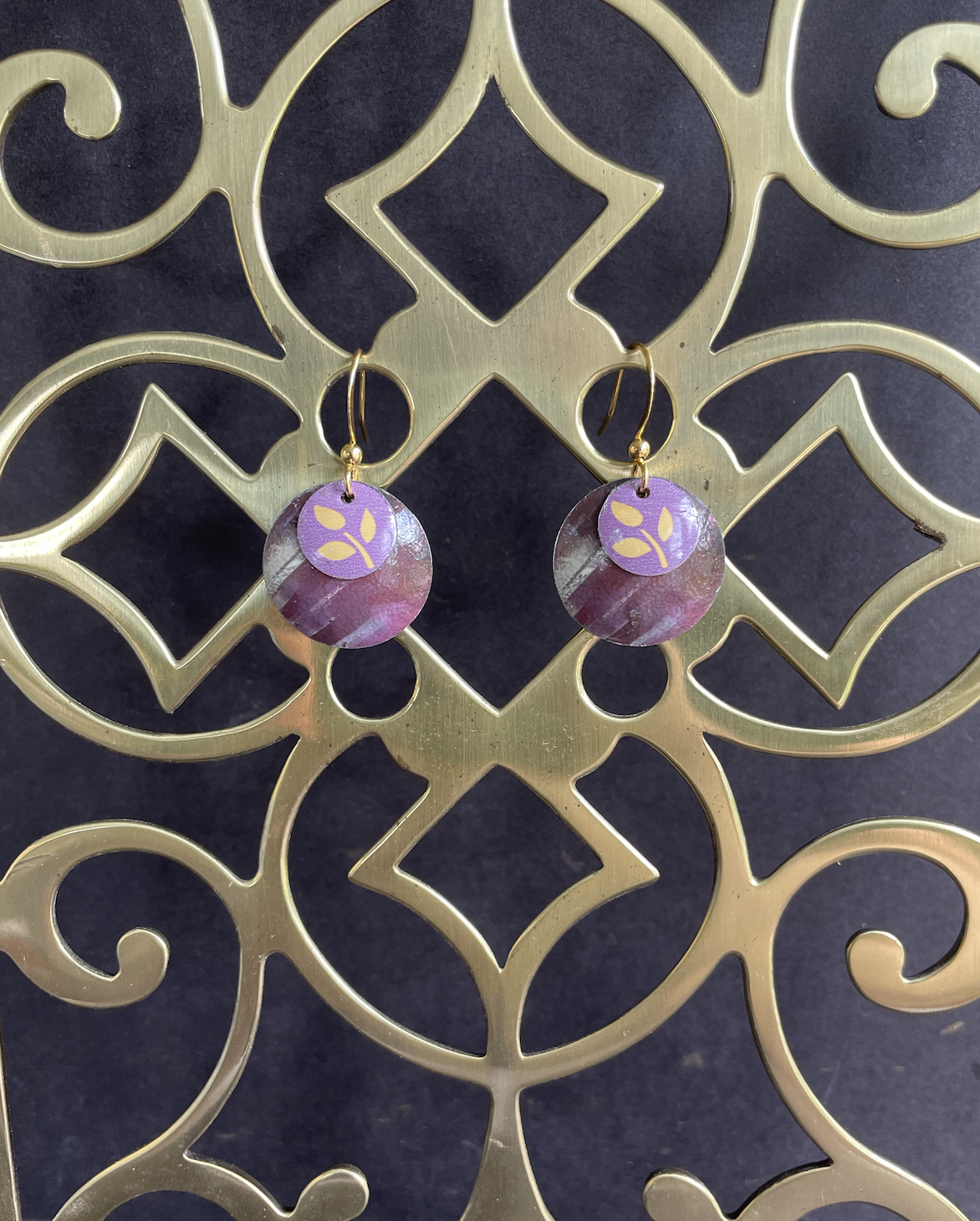 My original idea for making earrings out of tin was to do just this: nest several concave circles in one another. These specific nested earrings sport a purple background with a sprig of flora that may be wheat on the center piece. These gold plated earrings come with a rubber stopper so they won't fall out of your ears.