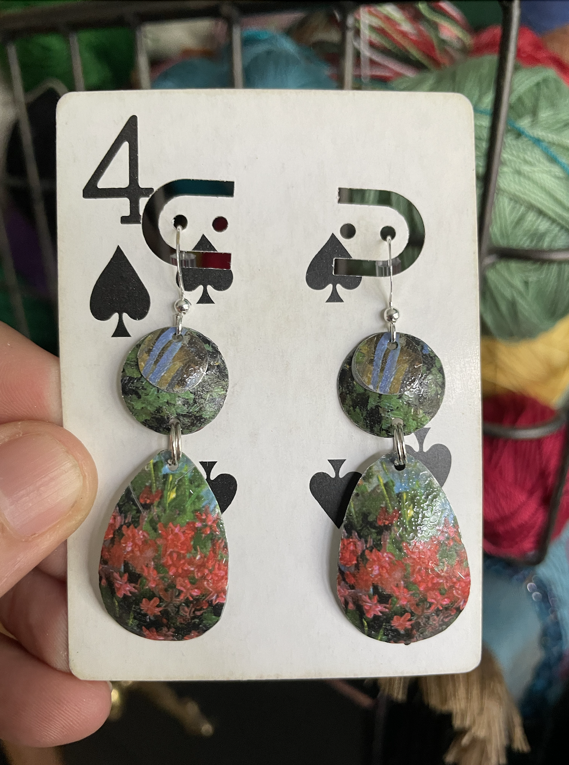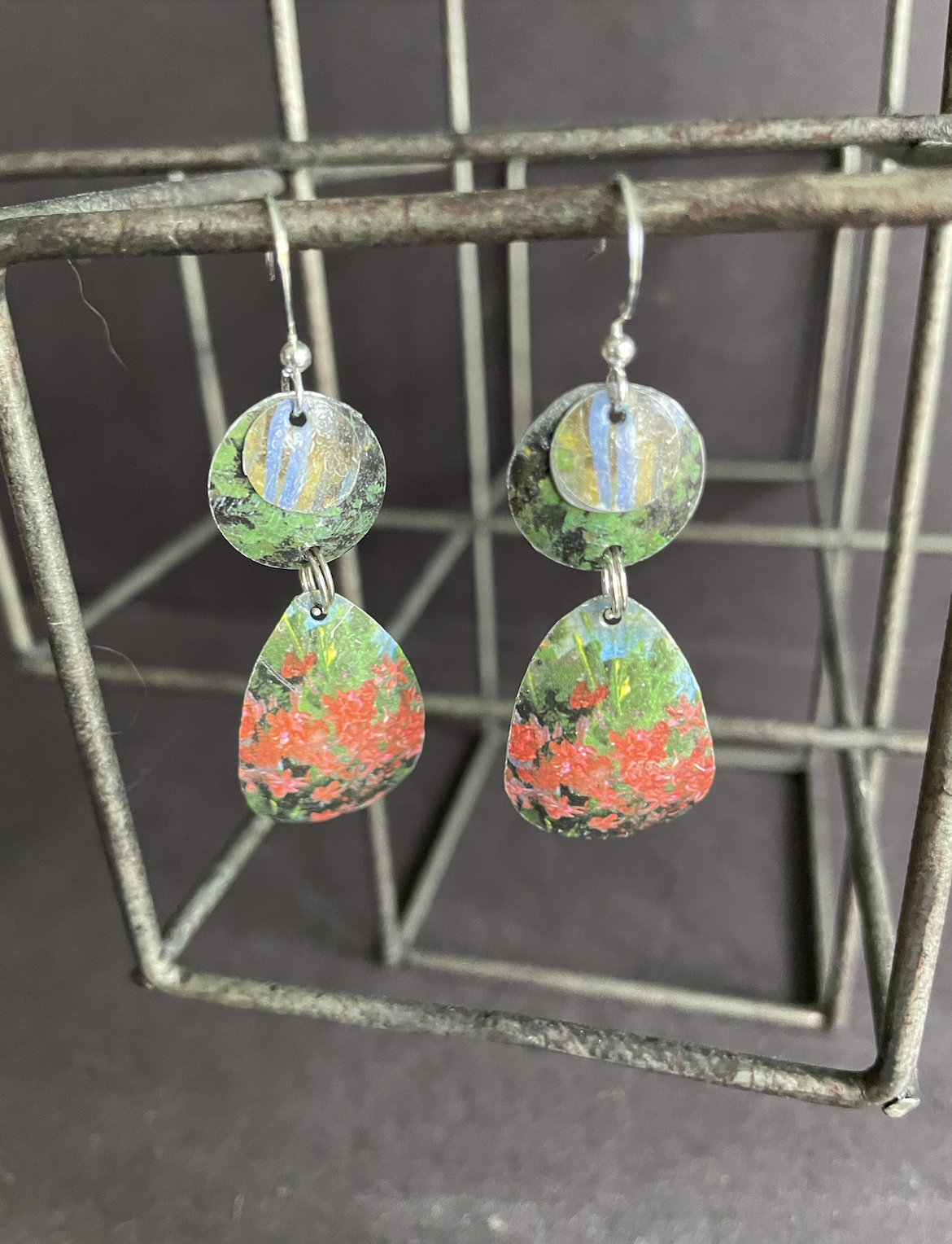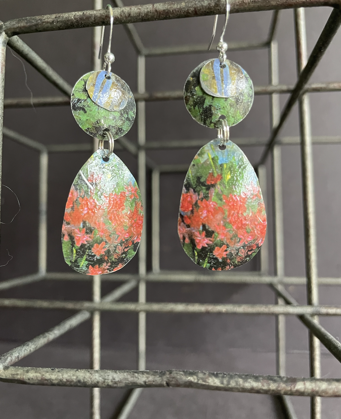 This popcorn tin showcased a quaint cafe and flower market scene in Paris. So quaint I named this collection "Gay Paris" (pronounced 'paree'). I love how the close-ups of so many of these bits create colorful abstract earrings, like these red begonia ones. These silver plated earrings come with a rubber stopper so they won't fall out of your ears.