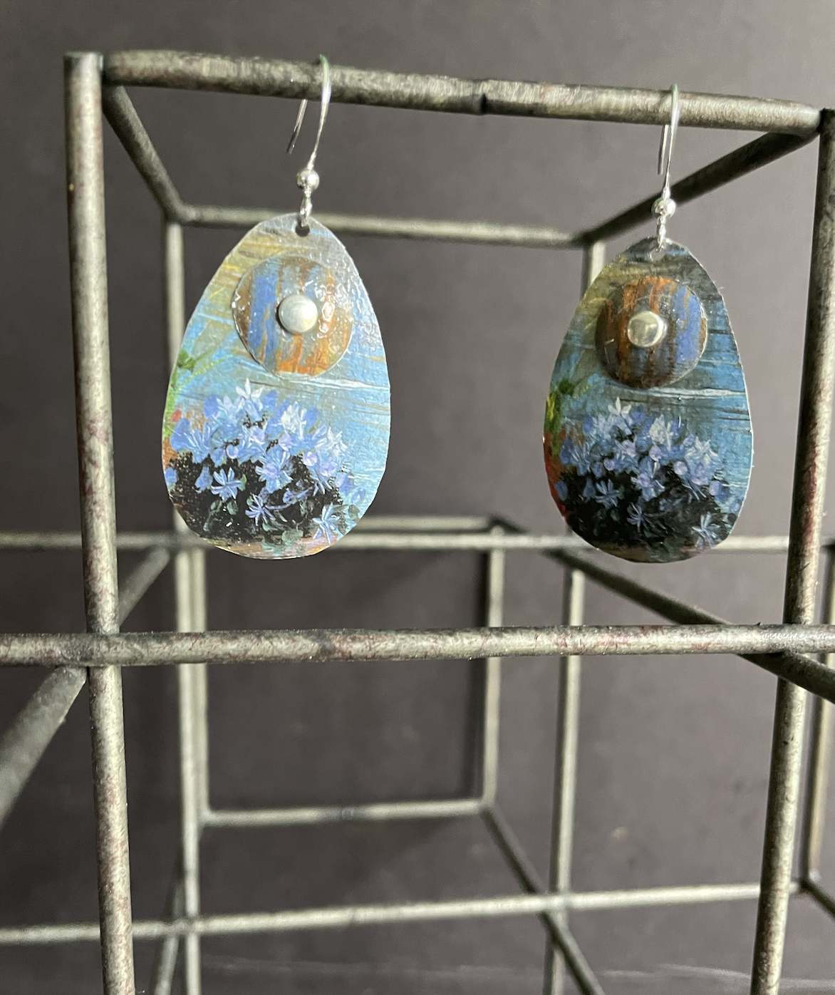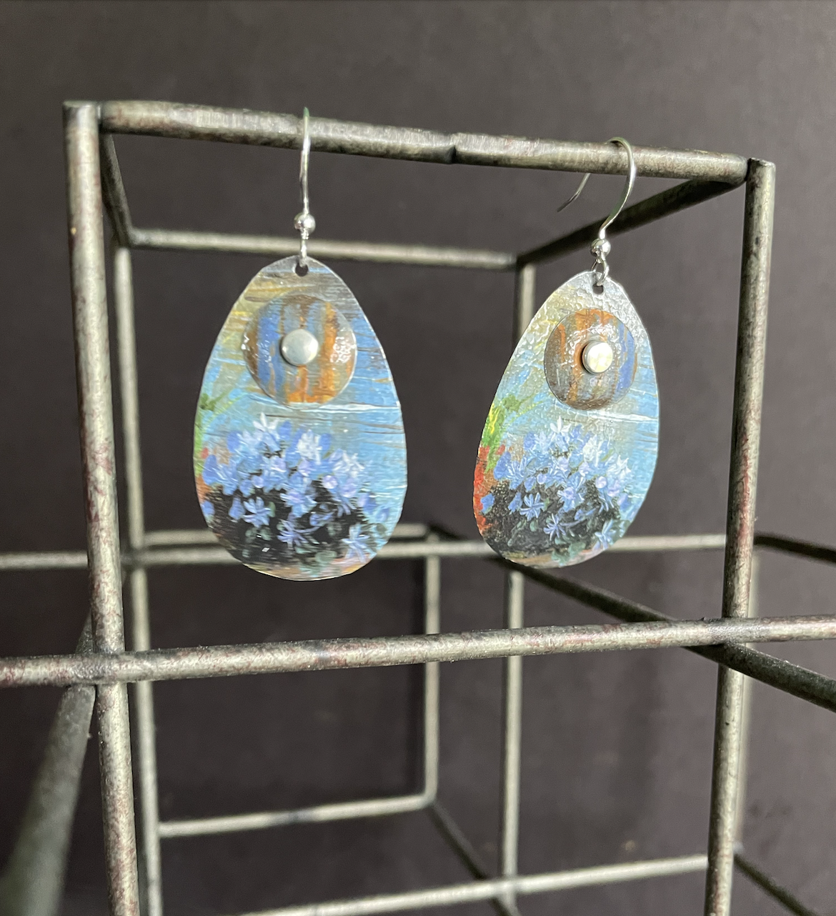 Tins are very light making them ideal for earrings as they don't weigh down your ears as the day goes on. Did you know the proper term for working with tin is "tinkering"? That made me really happy. I literally tinker in my art studio! I use old cookie tins, tea tins, and the like, break them down, and hand cut them into shapes and hand-hammer them into the 3-D shape I want them to be, finish and polish them, before putting them together like any other jewelry.
