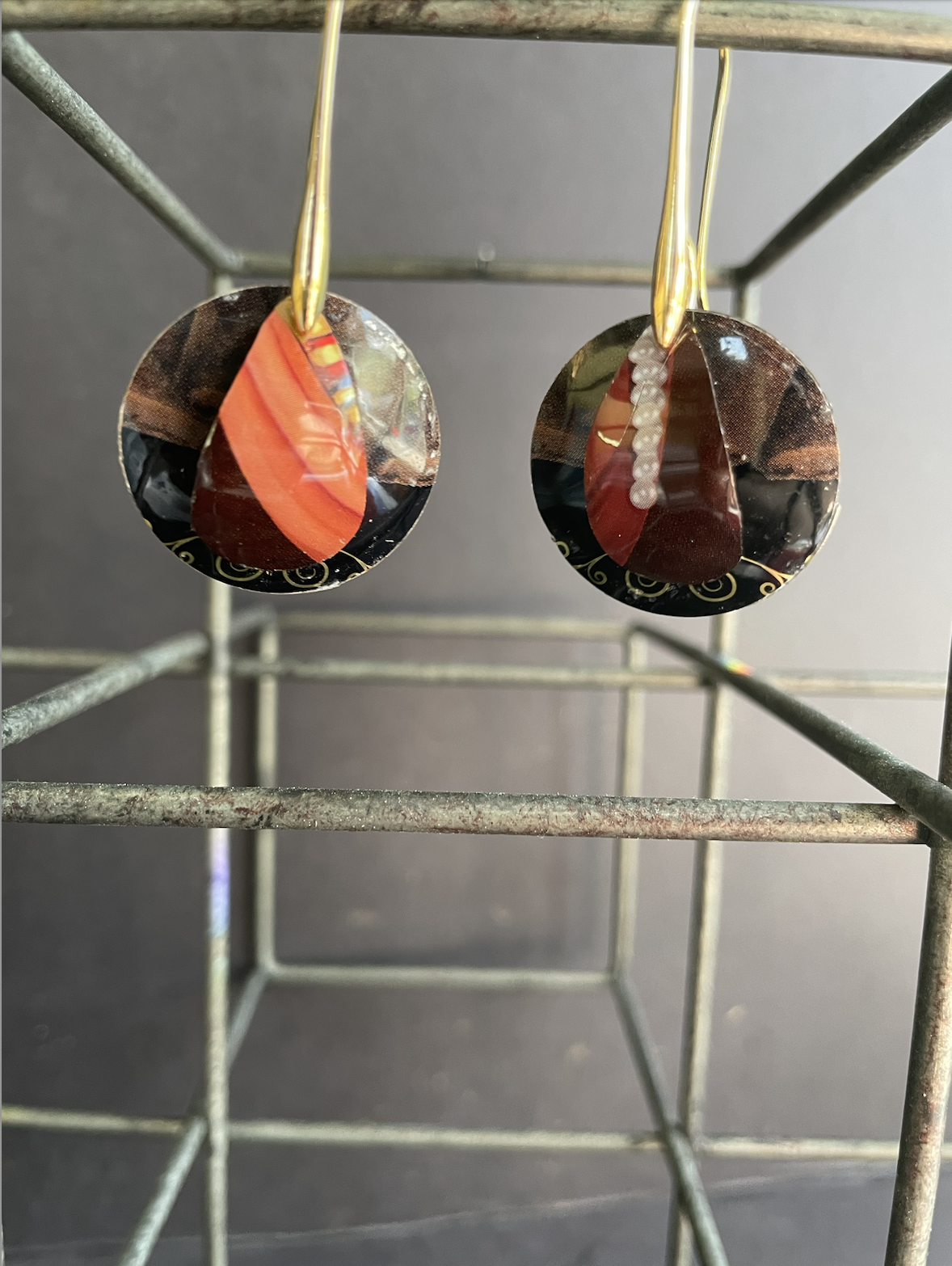 Tins are very light making them ideal for earrings as they don't weigh down your ears as the day goes on. Did you know the proper term for working with tin is "tinkering"? That made me really happy. I literally tinker in my art studio! I use old cookie tins, tea tins, and the like, break them down, and hand cut them into shapes and hand-hammer them into the 3-D shape I want them to be, finish and polish them, before putting them together like any other jewelry.