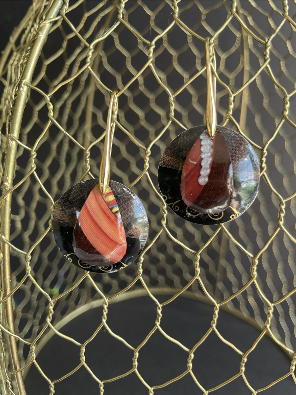 A dark kitty cat draped in royal finery sat on this tea tin. These earrings feature close ups of the feline's finery, especially a string of pearls. The earring findings are gold plated.