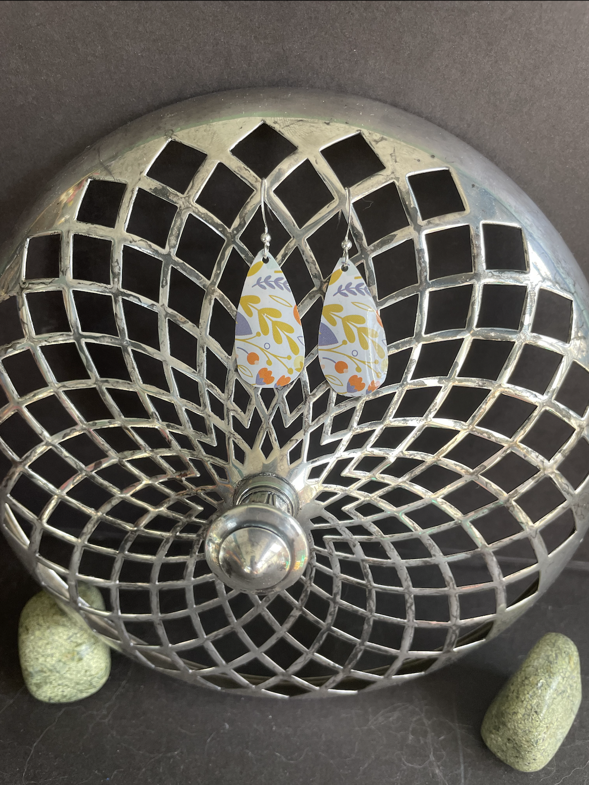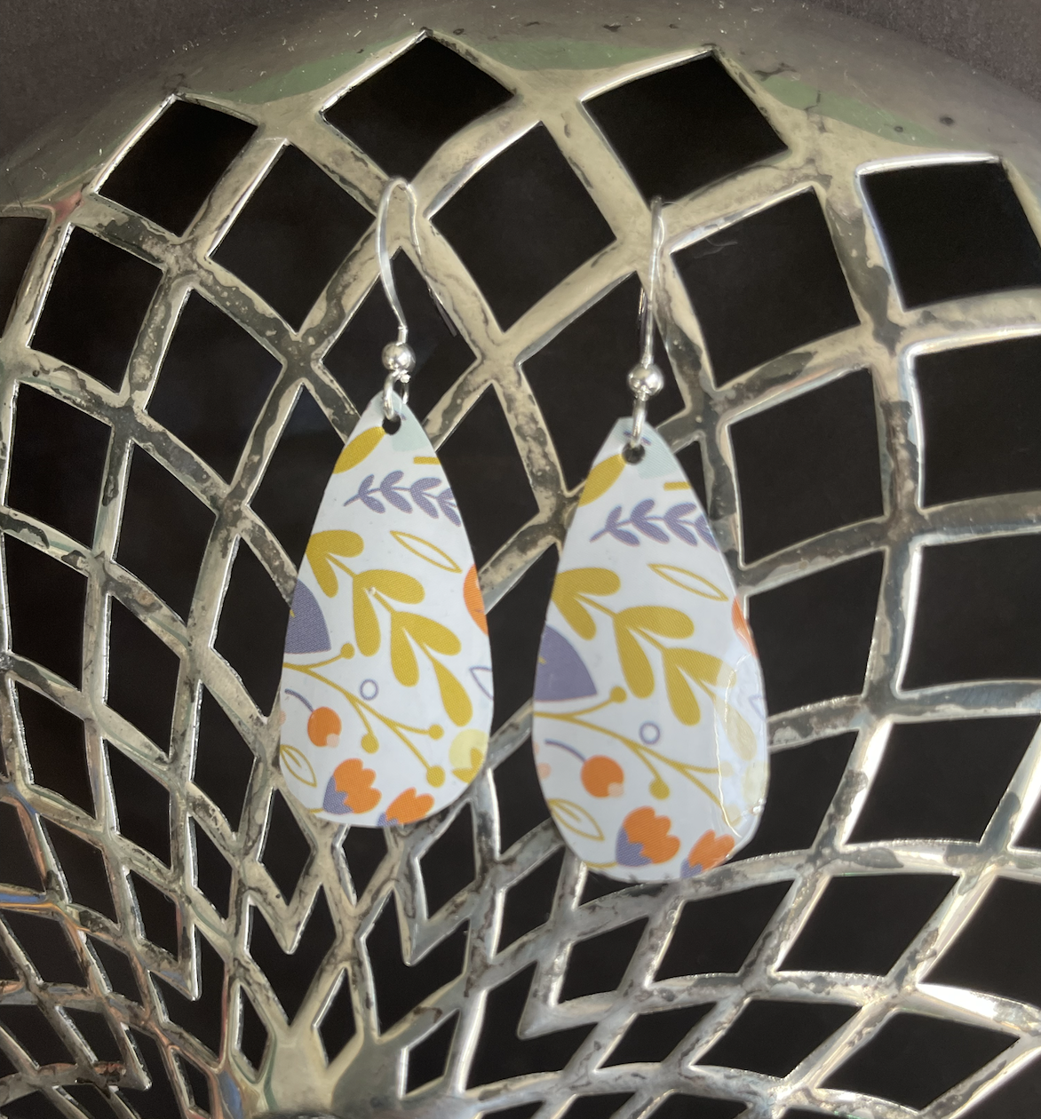 Tins are very light making them ideal for earrings as they don't weigh down your ears as the day goes on. Did you know the proper term for working with tin is "tinkering"? That made me really happy. I literally tinker in my art studio! I use old cookie tins, tea tins, and the like, break them down, and hand cut them into shapes and hand-hammer them into the 3-D shape I want them to be, finish and polish them, before putting them together like any other jewelry.