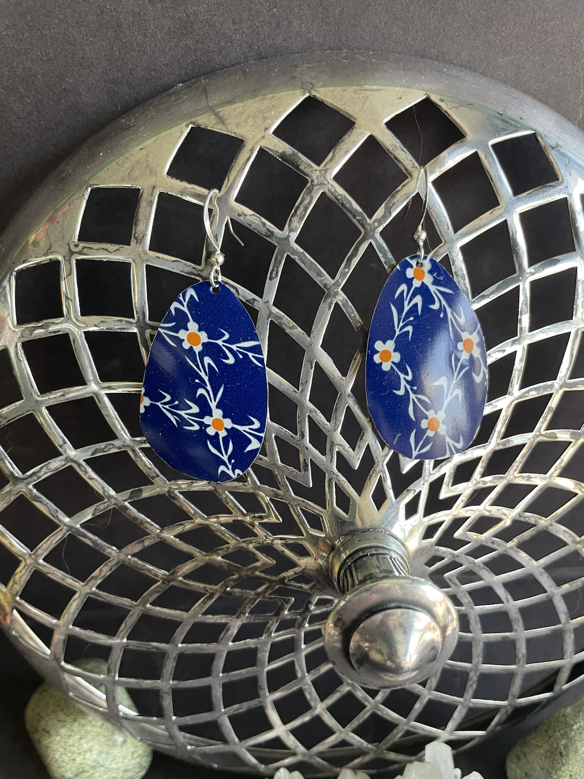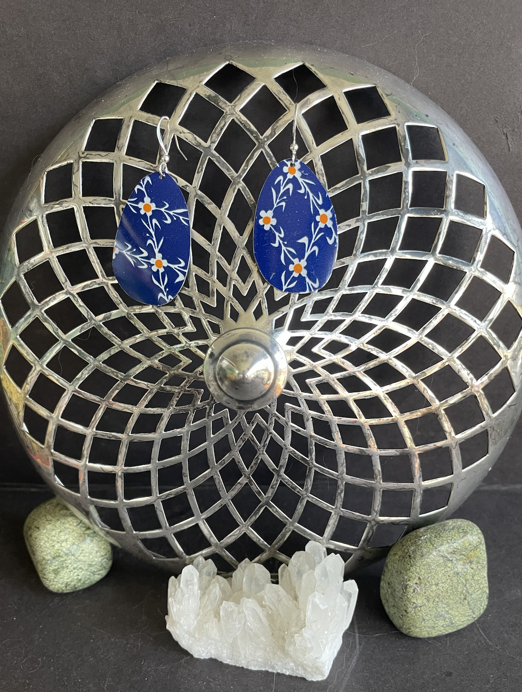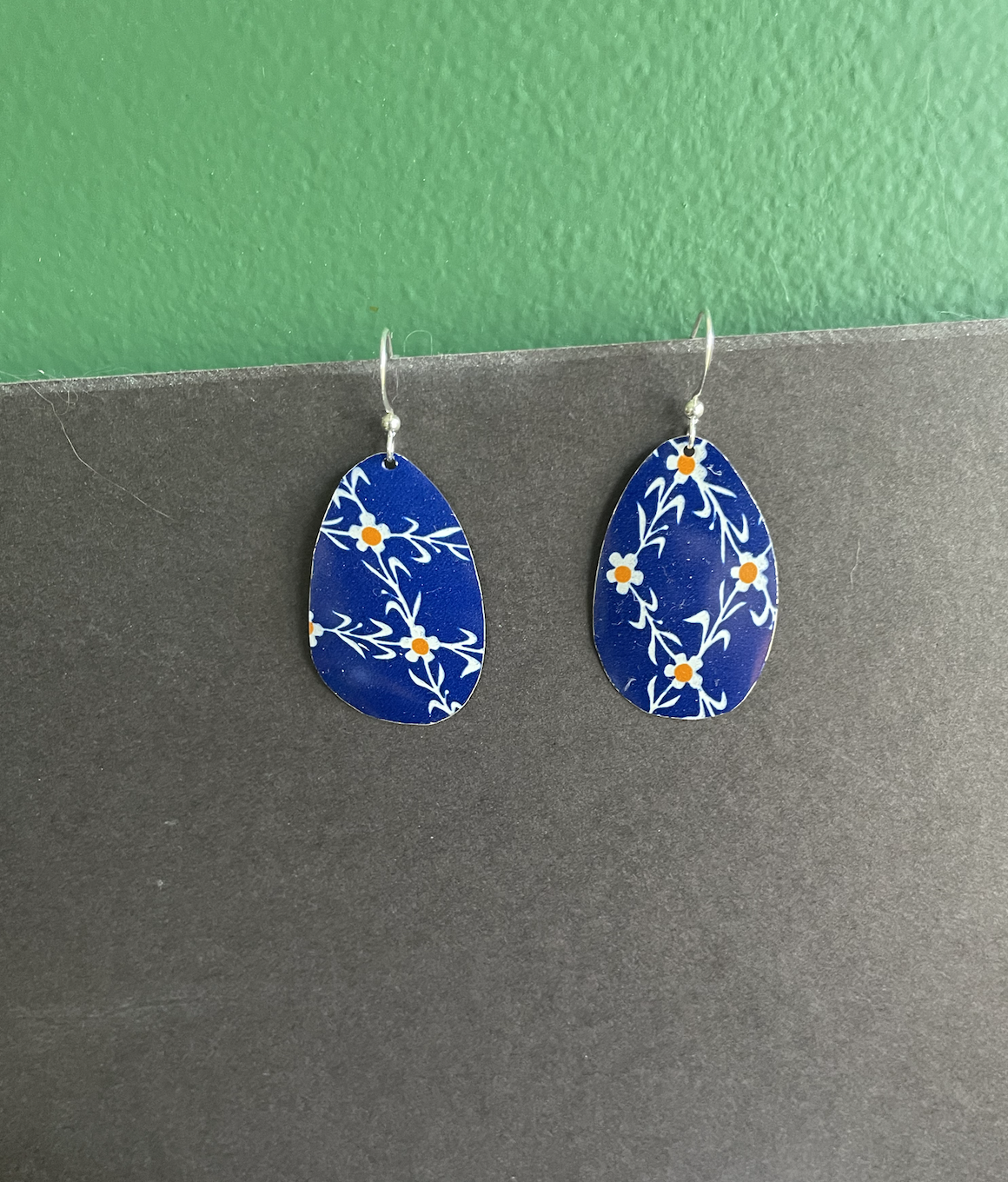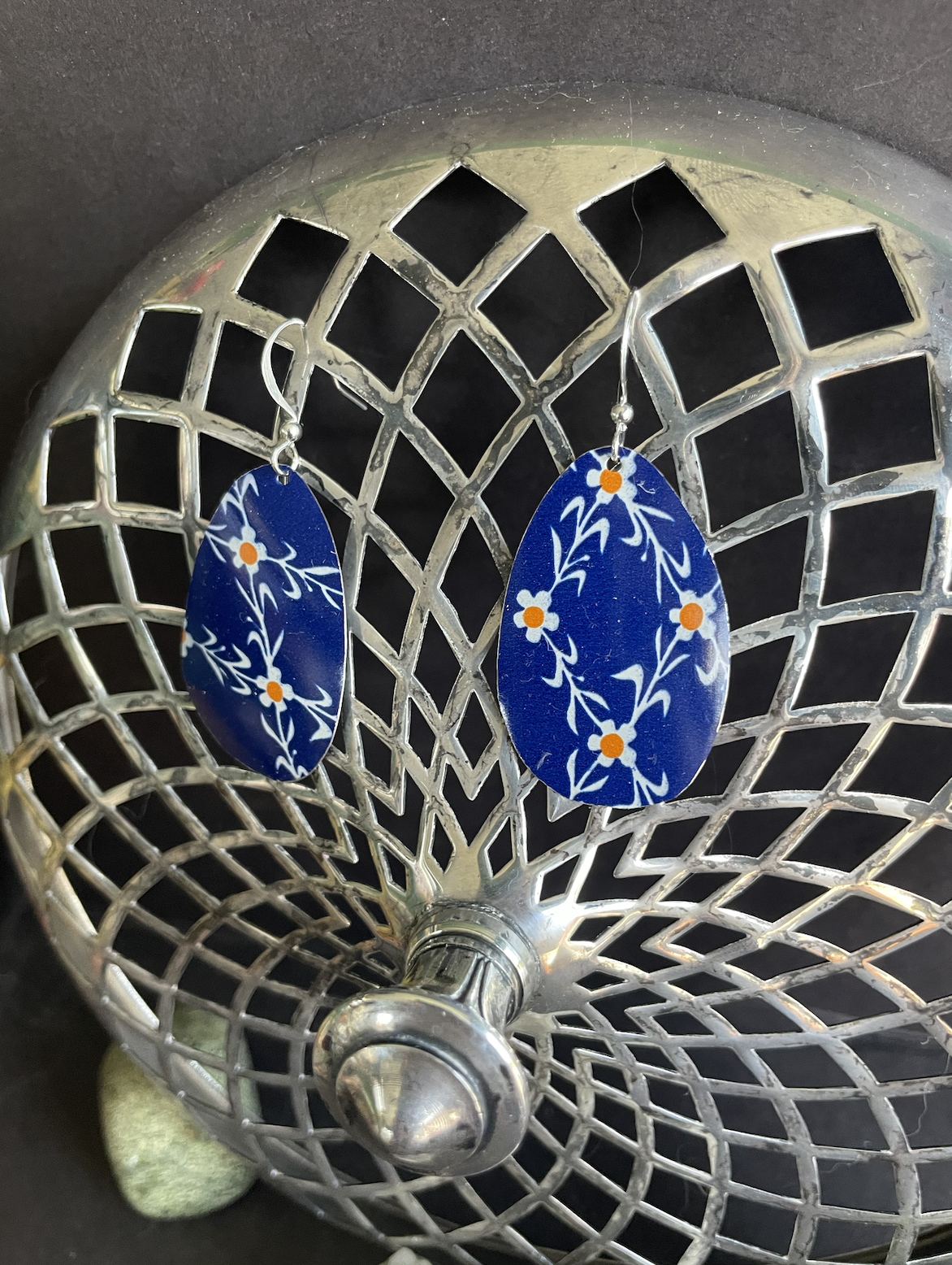 Tins are very light making them ideal for earrings as they don't weigh down your ears as the day goes on. Did you know the proper term for working with tin is "tinkering"? That made me really happy. I literally tinker in my art studio! I use old cookie tins, tea tins, and the like, break them down, and hand cut them into shapes and hand-hammer them into the 3-D shape I want them to be, finish and polish them, before putting them together like any other jewelry.