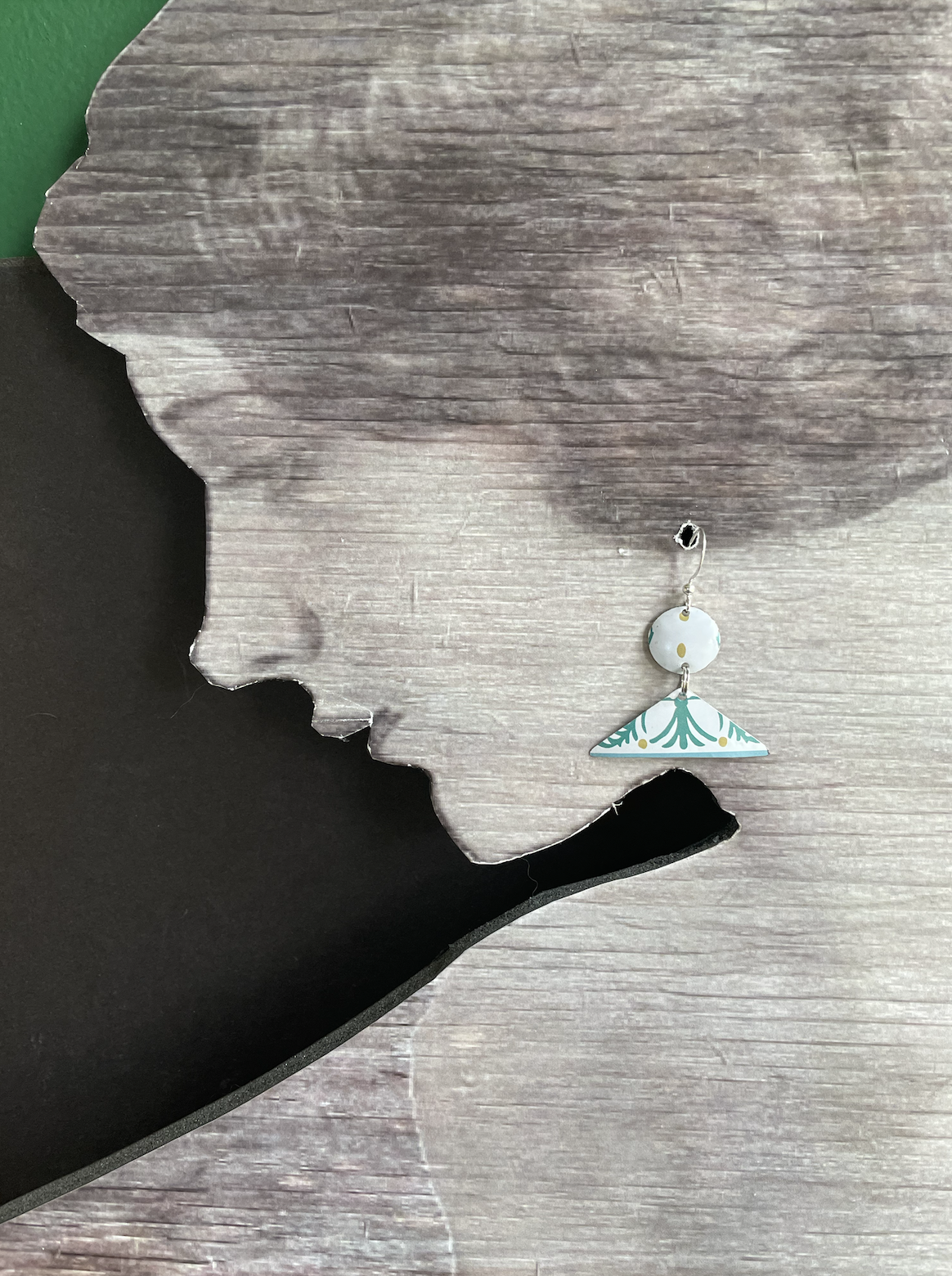 Triangular and teal designs for the eclectic in all of us. The earring findings are silver-plate and have no nickel. They come with a rubber stopper on the back so they won't fall out of your ears.