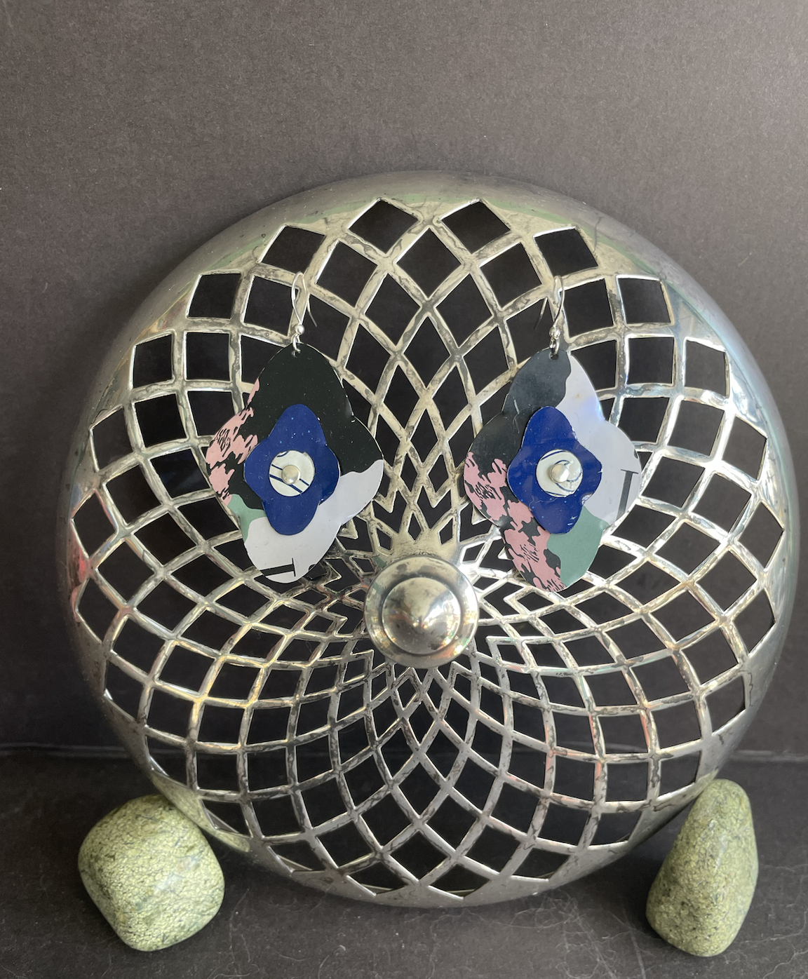 Tins are very light making them ideal for earrings as they don't weigh down your ears as the day goes on. Did you know the proper term for working with tin is "tinkering"? That made me really happy. I literally tinker in my art studio! I use old cookie tins, tea tins, and the like, break them down, and hand cut them into shapes and hand-hammer them into the 3-D shape I want them to be, finish and polish them, before putting them together like any other jewelry.