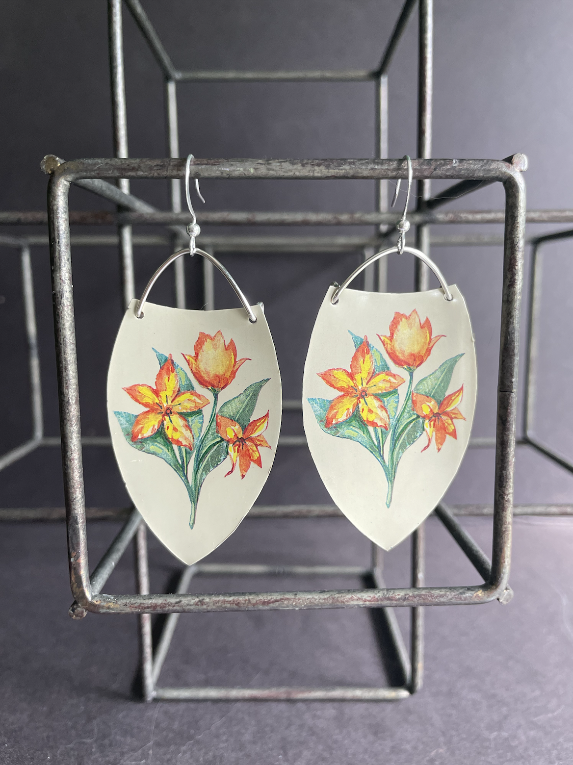 Tins are very light making them ideal for earrings as they don't weigh down your ears as the day goes on. Did you know the proper term for working with tin is "tinkering"? That made me really happy. I literally tinker in my art studio! I use old cookie tins, tea tins, and the like, break them down, and hand cut them into shapes and hand-hammer them into the 3-D shape I want them to be, finish and polish them, before putting them together like any other jewelry.