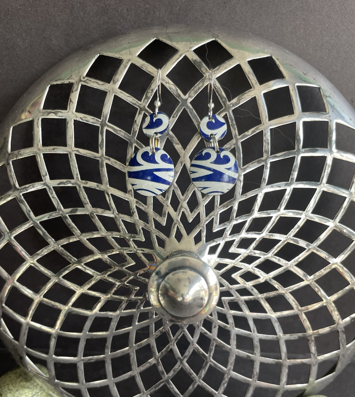 Tins are very light making them ideal for earrings as they don't weigh down your ears as the day goes on. Did you know the proper term for working with tin is "tinkering"? That made me really happy. I literally tinker in my art studio! I use old cookie tins, tea tins, and the like, break them down, and hand cut them into shapes and hand-hammer them into the 3-D shape I want them to be, finish and polish them, before putting them together like any other jewelry.