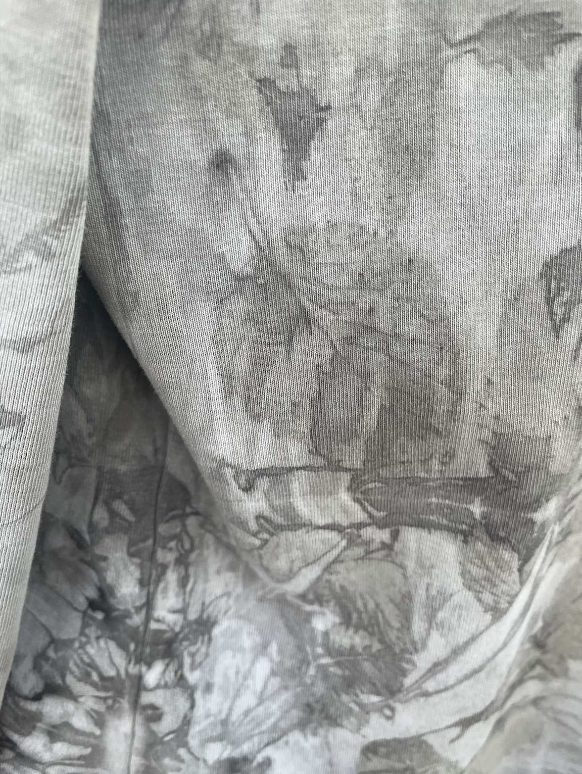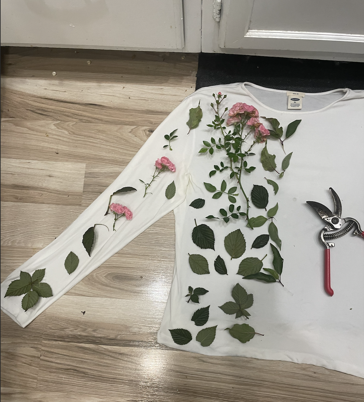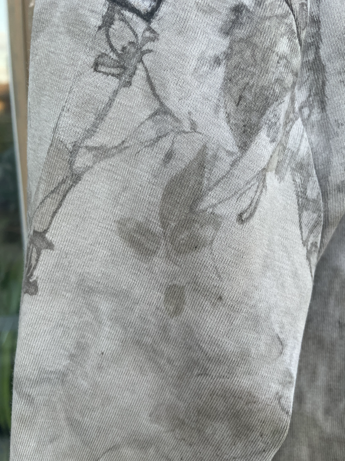 Eco-printing is a process of pressing the entire dye plant against the fabric and transferring the color while the plant stays flat, without the use of chemical mordants.